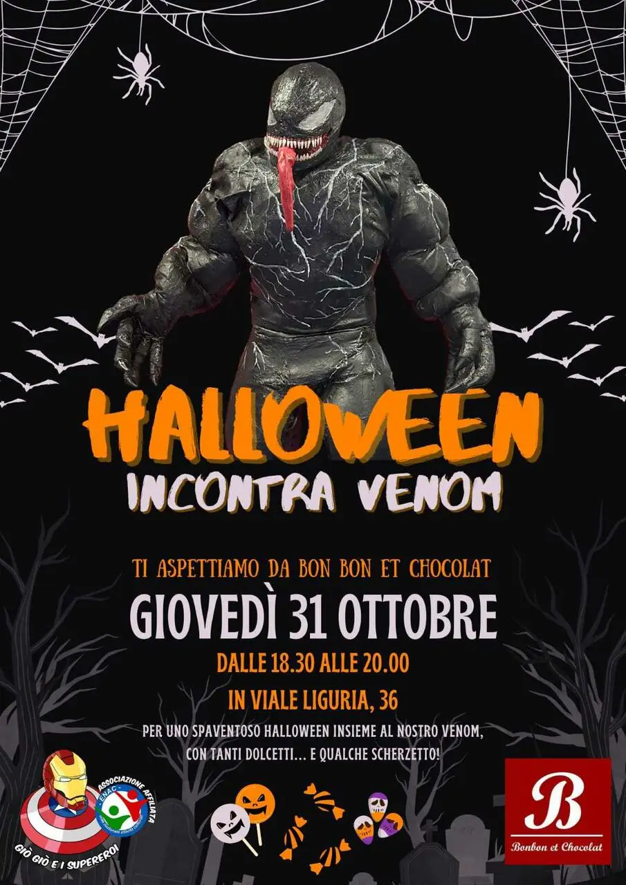 Volete conoscere Venom (dell’Associazione Giò Giò e i Supereroi)? Bene, l’occasione più ghiotta per scattare foto e ammirare lo storico nemico di Spider Man è dietro l’angolo: in occasione della notte di Halloween basterà recarsi presso Bonbon Et Chocolat in Via Liguria 36, giovedì 31 ottobre dalle 18:30 alle 20:00… Vi aspettiamo per uno spaventoso Halloween con tanti dolcetti e scherzetti…