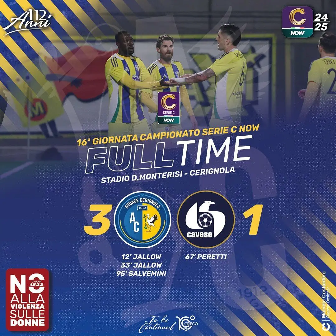 MARCATORI 18′, 32′ Jallow (Audace Cerignola), 68′ Peretti (Cavese), 95′ Salvemini (Audace Cerignola)