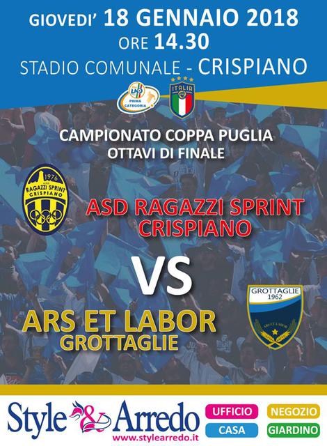 Trasferta a Crsipiano per l’Ars e t Labor Grottaglie nella gara di andata degli ottavi di Coppa Puglia. I crispianesi sono arrivati al terzo turno eliminando prima l’Atletico Martina (2^ categoria) e poi il Mottola nei sedicesimi. Il Grottaglie vi è giunto vincendo il triangolare eliminatorio con Fragagnano (2^ categoria) e il San Marzano mentre nel secondo turno ha eliminato il Manduria. Umori diversi per le due squadre che in campionato vivono momenti opposti: preoccupante la situazione del Crispiano che non riesce a tirarsi fuori dalle sabbie mobili della zona Play-out e nelle ultime 5 partite ha ottenuto solo un punto, esaltante la condizione del Grottaglie che vince da sette partite consecutive ed è secondo in classifica. La Coppa per il Grottaglie è un obiettivo, forse un Po’ meno per il Crispiano che comunque non scenderà certo in campo ad armi basse. La gara di Coppa giunge alla vigilia della prima giornata del girone di ritorno con le due compagini impegnate in due incontri delicati, il Crispiano giocherà in casa contro la Rutiglianese, seconda in classifica) mentre il Grottaglie andrà in trasferta a Locorotondo contro la Virtus. Due match che probabilmente condizioneranno le scelte degli allenatori che, nei giusti limiti, vorranno preservare alcuni giocatori. Sulla carta il Grottaglie parte favorito ma la Coppa riserva sempre emozioni considerando che i match si vincono nell’arco dei 180 minuti e oltre.