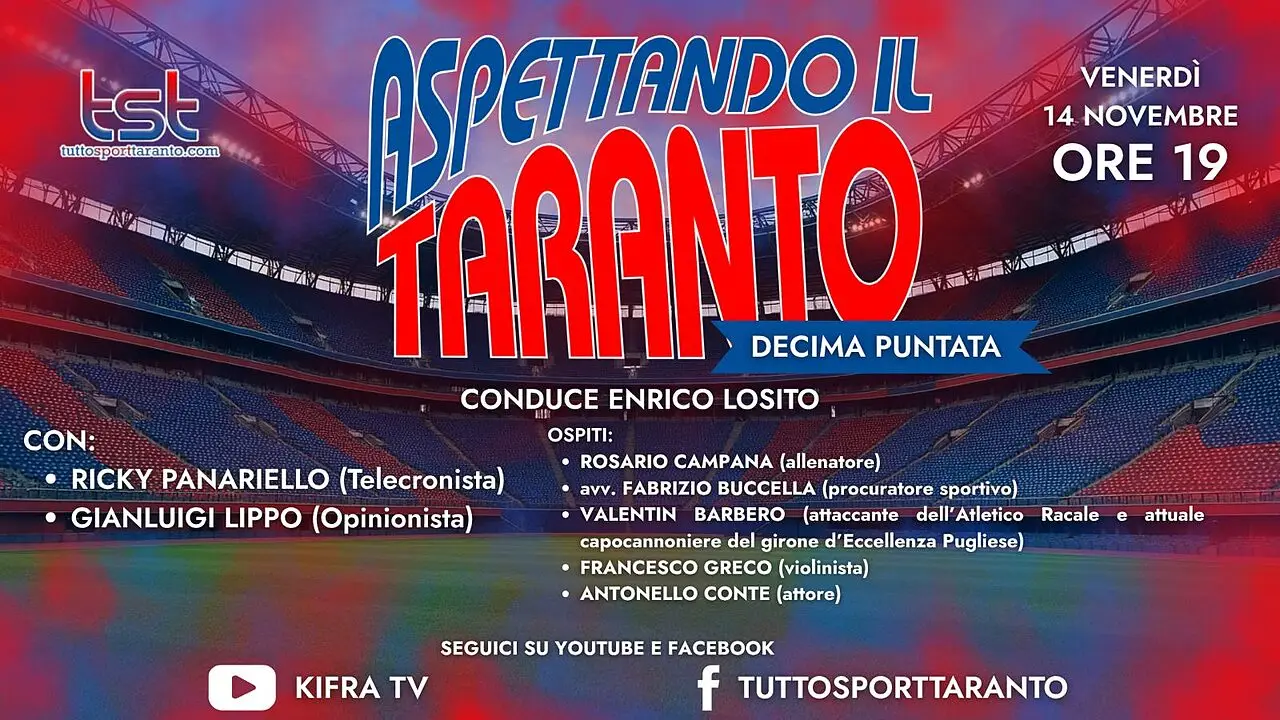 Venerdì 14 novembre dalle ore 19:00 in diretta dagli studi di Ki.fra Tv nuovo appuntamento con “ASPETTANDO IL TARANTO”, il contenitore sportivo a cura della redazione di Tutto Sport Taranto.com condotto da Enrico Losito, coadiuvato dal telecronista Ricky Panariello e dall’opinionista Gianluigi Lippo con la regia di Claudio Ingrosso. Nel corso della puntata tratteremo le tematiche di stretta attualità della SS Taranto Calcio commenteremo l’ultima gara di campionato con il Foggia Incedit e di Coppa Italia con l’Atletico Acquaviva proiettandoci alla prossima gara in trasferta contro l’Atletico Racale. Ospite in studio: Antonello Conte, attore teatrale mentre in collegamento esterno ci saranno: Rosario Campana, allenatore, l’avv. Fabrizio Buccella, procuratore sportivo; Valentin Barbero, attaccante dell’Atletico Racale e attuale capocannoniere del girone d’Eccellenza Pugliese e Francesco Greco, violinista. Vi aspettiamo in diretta sulle pagine ufficiali Facebook, Youtube e Twich di Tutto Sport Taranto e Ki.fra tv dalle ore 19:00 con le vostre domande, commenti e opinioni…NON MANCATE!!! Il contenitore sportivo è stato realizzato grazie al supporto di Studio Fornaro-Occhinegro dottori commercialisti associati, in Piazzale Dante, 8 a Taranto; in via Skanderbeg, 64 a Bari e in via Einaudi, 10 a Locorotondo (BA); Erario Ottavio Srls – Costruzioni edilizie in via Don Minzoni, 2 a Manduria (TA); 101 Desideri Floreali, Via Lama, 120 a Lama (TA) cell. 389/5245740; Hotel Virgilio "Una Terrazza sul Mare " Viale Virgilio, 4 a Taranto tel. 099/4594116; Nolocar Srls , via Galeso, 355 a Taranto cell. 346/5075088; Headway Travel di Ascoli Annunziata, Piazza Vittorio Veneto, 3 a Palagiano (TA) tel. 099/6528083; Auto Zentrum Rent Car by Giuliani, sede di Mottola, via C.A.Dalla Chiesa, s.n.c.,tel.099/8051329; cell.388/4456544; 328/6130332; sede di Gioia del Colle via Giulio Pastore, 78; tel. 080/4729201; cell. 328/6130332.