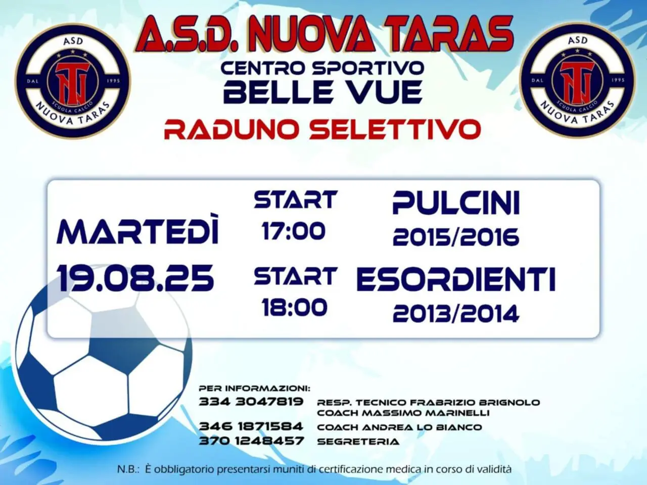 La società della Nuova Taras comunica che martedì 19 agosto 2025 presso il Centro Sportivo “Belle Vue” ci sarà un raduno selettivo per le categorie Pulcini (inizio alle ore 17:00) ed Esordienti (inizio ore 18:00). Per l’occasione ogni atleta dovrà essere munito di certificato medico in corso do validità.