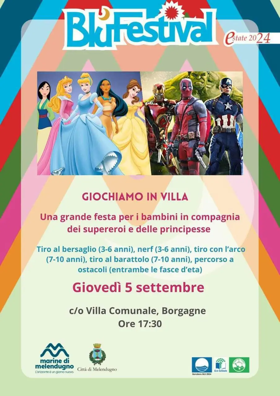 Il 5 settembre presso la Villa Comunale di Borgagne (Marine di Melendugno) dalle 17:30 si svolgerà il Blu Festival con Supereroi e Principesse. Per l’occasione l’Associazione Giò Giò e i Supereroi intratterrà i piccoli partecipanti con attività a tema e al termine del percorso riceveranno direttamente dalle mani dei Supereroi un attestato di partecipazione. L’ingresso è gratuito.