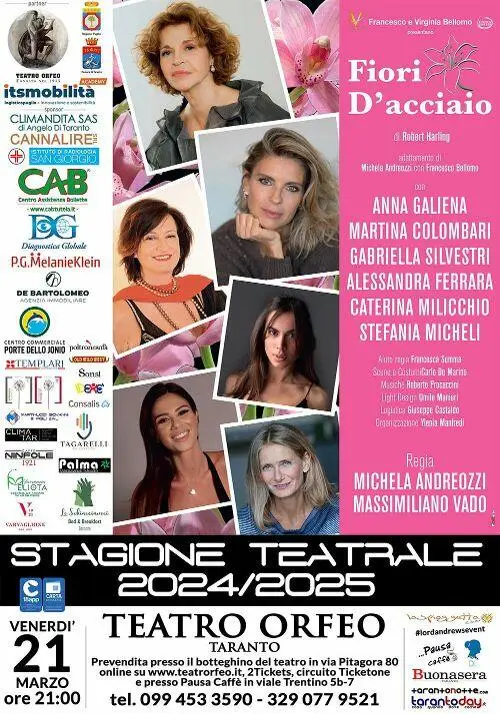 “Fiori d’Acciaio” al Teatro Orfeo di Taranto, domani, venerdì 21 marzo, alle ore 21. Uno strepitoso cast tutto al femminile con Anna Galiena, Martina Colombari, Gabriella Silvestri, Alessandra Ferrara, Stefania Micheli e Flora Contrafatto. Regia di Michela Andreozzi e Massimiliano Vado. “Fiori d’Acciaio”, nella sua versione cinematografica, è uno dei romanzi di formazione che hanno accompagnato la giovinezza di diverse generazioni insieme a “Piccole Donne”, “Harry ti Presento Sally” e “Colazione da Tiffany”: storie di donne, grandi figure femminili che crescono, sbagliano, si confrontano, amano, odiano, combattono e qualche volta muoiono. È un film che spiega cosa significa essere donne e nonostante ciò fare fronte comune, ovvero la solidarietà femminile. Che poi tradotto in azione significa conservare la propria identità, ritagliarsi un ruolo nel mondo, costruirsi uno spazio, intessere delle relazioni o alimentare dei conflitti e malgrado tutto essere in grado di unirsi. Un cast ricco e variegato, una banda di soliste in grado di suonare insieme, ma di battere in volata quando serve.