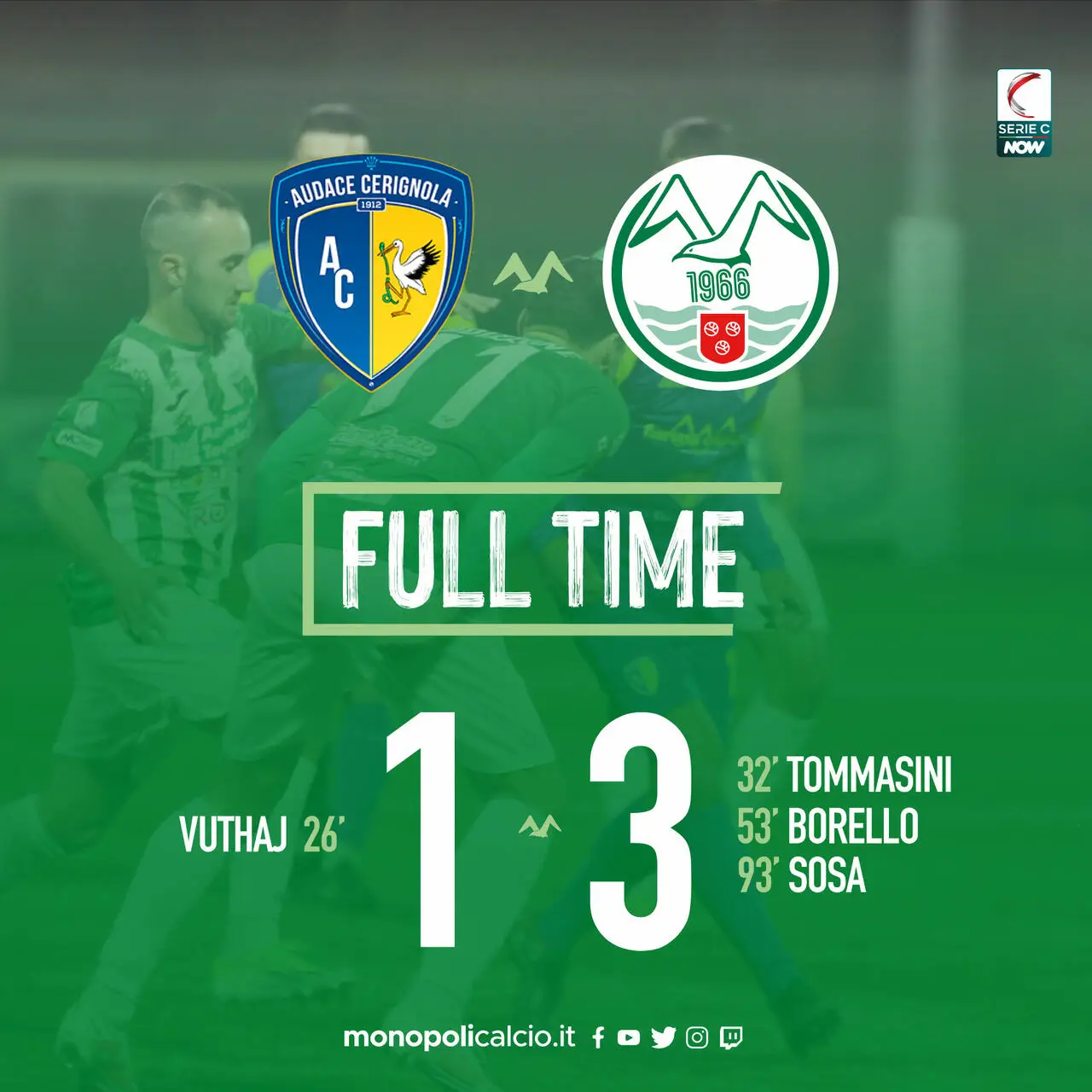 AUDACE CERIGNOLA VS MONOPOLI 1-3 Reti: 27’ Vuthaj 33’ Tommasini 54’Borello,93 Sosa