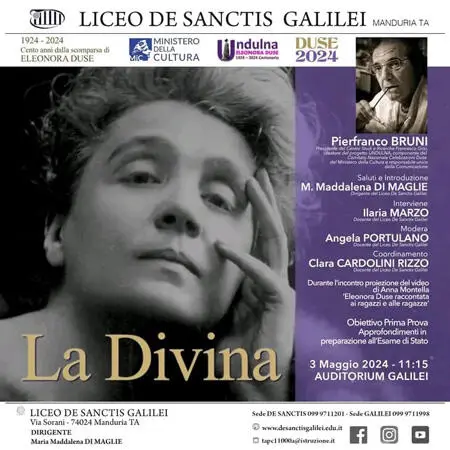 Manduria (Taranto) con il suo Liceo De Sanctis - Galilei il prossimo 3 maggio alle 11.15, Auditorium Galilei, rende omaggio alla Divina, ovvero a Eleonora Duse nel centenario della scomparsa, con una mattinata dedicata al ruolo importante che l'attrice ha avuto tra fine Ottocento e I primi venti anni del Novecento.