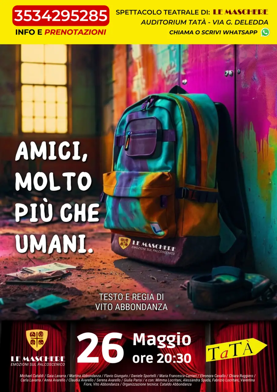 Che cos’è davvero l’amicizia? Questa domanda è il punto di partenza dello spettacolo dal titolo “Amici, molto più che umani” che sarà messo in scena domenica 26 maggio (inizio ore 20:30) all’Auditorium Tatà di Taranto (sito in via G. Deledda) dai giovani attori della Compagnia Teatrale “Le Maschere”. Un gruppo di ragazzi di una scuola si ritrova a svolgere un laboratorio di fine anno, anche se non riescono in nessun modo a collaborare o andare d’accordo. Gli amici non esistono, gli amici tradiscono, dagli amici mi guardi Dio che dai nemici mi guardo io; questi sono i pensieri dei ragazzi all’inizio dello spettacolo. Quello che costringe i ragazzi a collaborare è la scoperta che il laboratorio non è un semplice corso di fine anno, ma una prova del fuoco, se non verrà superata, verranno espulsi dalla scuola. Il preside avrà l’ultima parola sull’elaborato finale e sulla permanenza dei ragazzi a scuola. Secondo quello che viene realizzato dai ragazzi, a salvare l’umanità dall’estinzione nei secoli è stata l’amicizia, ciò che rende gli esseri umani, molto più che umani. I testi e la regia dello spettacolo sono curati da Vito Abbondanza che sullo spettacolo afferma: “A questo spettacolo ci tengo particolarmente perché i protagonisti sono i miei ragazzi al quale parteciperà anche il Falanto Chorus. Lo spettacolo tratta dell’amicizia che riguarda tutti sia i più giovani che gli adulti. Il punto di partenza per noi è stato “Cos’è l’amicizia?” I nostri ragazzi hanno iniziato a sviluppare questa tematica partendo dal lato negativo infatti l’amico è quello che ti tradisce e di lui non ti puoi fidare, dagli amici mi guardi Dio che dai nemici mi guardo io. Dallo sviluppo di questa tematica, i nostri giovani attori dovranno superare un compito e chi verrà ad assistere allo spettacolo scoprirà cos’è davvero l’amicizia e se i ragazzi avranno superato o no il compito. Questo spettacolo è il nostro fiore all’occhiello, lo scorso anno piacque molto l’altro spettacolo che portammo in scena con i nostri allievi trattando la tematica della guerra. Quest’anno abbiamo trattato un tema più vicino ai giovani e vogliamo che anche il pubblico adulto sia attratto da questo spettacolo. Chi ha veramente degli amici? Forse è questa la domanda a cui lo spettatore potrà rispondere dopo avere visto lo spettacolo perché in un mondo come questo dove siamo così vicini e lontani nello stesso tempo con i social network, i follower e tanto altro non ci rendiamo conto di cos’è davvero l’amicizia e non capiamo chi sono i veri amici”. Per tutti gli interessati la sede de “La Compagnia Le Machere” è sita a Taranto in via Salina Piccola, 4 - Zona Taranto 2, le prevendite sono attive in sede ogni venerdì dalle ore 18:30 alle 20:30 e il sabato dalle ore 09:00-11:00 e dalle ore 17:00-19:00. Posto unico al prezzo di €. 10:00. Per info biglietti chiamare il numero 353/4295285.