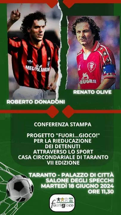 La conferenza stampa di presentazione dell’evento finale si terrà Martedì 18 Giugno alle ore 11.30 nel Salone degli Specchi del Comune di Taranto. Oltre alla presenza delle massime cariche istituzionali, sono previsti gli interventi di Roberto Donadoni ex calciatore del Milan e della Nazionale Italiana e di Renato Olive ex capitano di Perugia e Bologna, i quali nella stessa mattinata incontreranno i detenuti partecipanti all’iniziativa all’interno della Casa Circondariale.