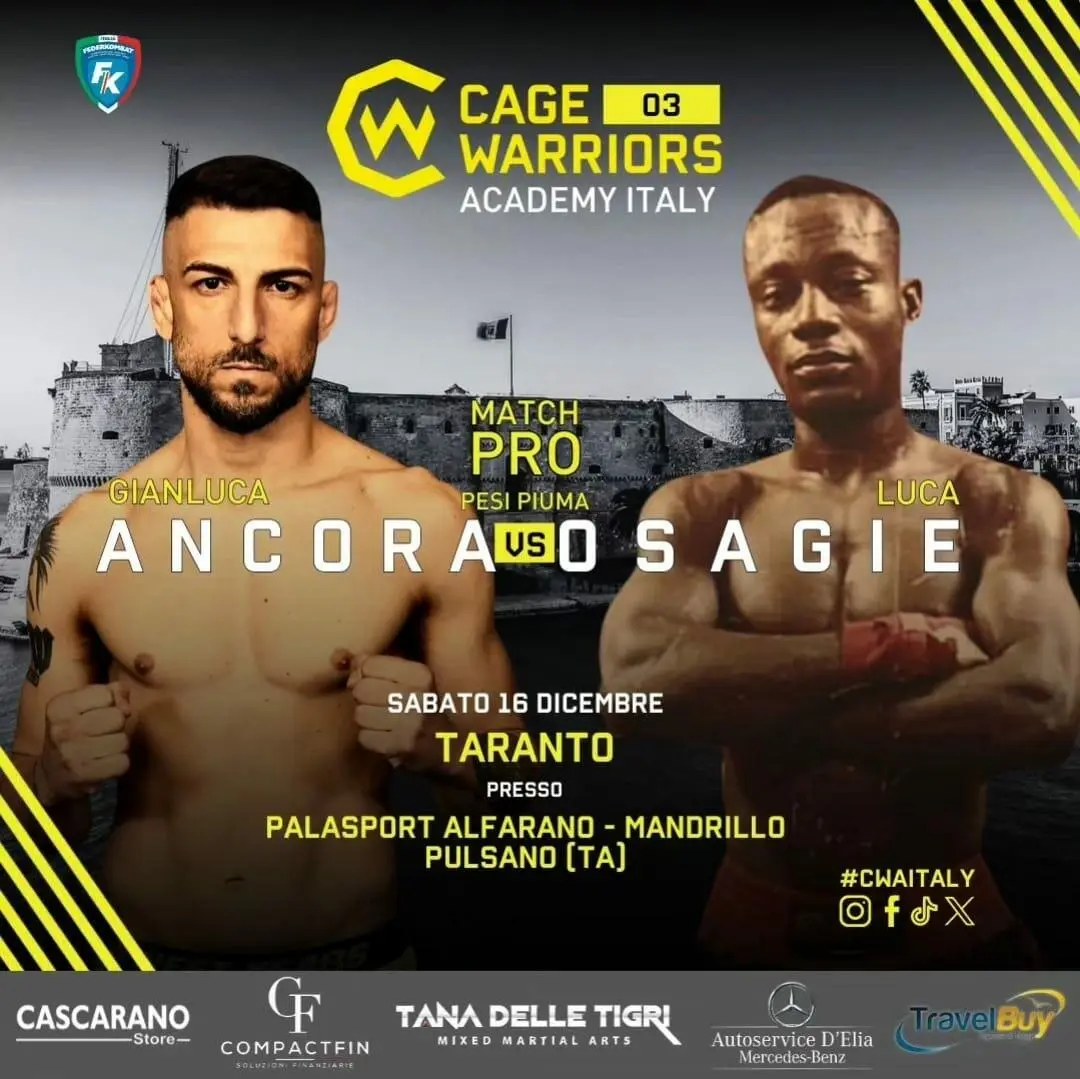 La promotion europea Cage Warriors, storica anticamera di campioni UFC, che dal 2022 ha scelto l’Italia come polo attrattivo per il sud europa, sarà ospitata dalla provincia di Taranto, più precisamente dal Palazzetto dello Sport "Alfarano - Mandrillo" di Pulsano sabato 16 dicembre.