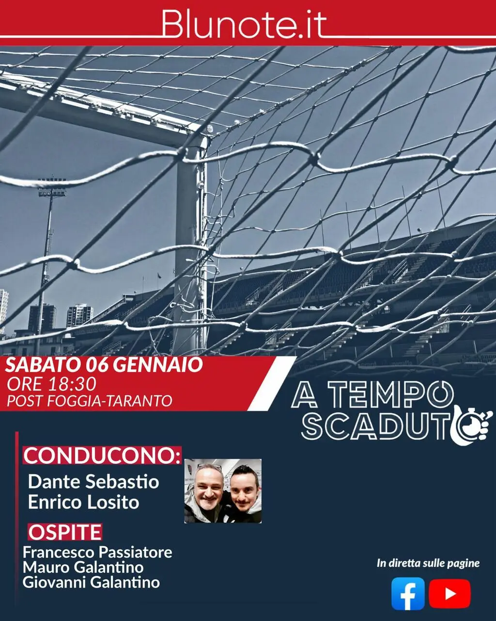 Sabato 6 gennaio dalle ore 18:30, appuntamento con “A TEMPO SCADUTO”, il contenitore sportivo a cura della redazione di Blunote.it. condotto da Dante Sebastio ed Enrico Losito. Commenteremo il derby Foggia-Taranto con il nostro Anthony Carrano , l’allenatore Francesco Passiatore e in collegamento esterno dalla Farmacia Galantino (uno dei nostri sponsor) con il dott. Mauro Galantino e Giovanni Galantino in qualità di opinionisti. Vi aspettiamo in diretta sulle pagine ufficiali Facebook e Youtube di Blunote Web dalle ore 18:30! Il contenitore sportivo è stato realizzato grazie al supporto di Hotel Virgilio in Viale Virgilio, 4 a Taranto; Ipersport in via per S. Giorgio Jonico km 10 (contrada Cimino) a Taranto; Elettrica Martino in Via De Cesare, 8/10 a Taranto; Studio Radiologico San Tommaso in via Luigi Settembrini, 232 a Talsano (TA); Teatro Cinema Orfeo in via Pitagora, 98 a Taranto; Studio Fornaro-Occhinegro dottori commercialisti associati, in Piazzale Dante, 8 a Taranto; in via Skanderbeg, 64 a Bari e in via Einaudi, 10 a Locorotondo (BA); Studio Dentistico Sannelli Dr. Vito e Fabio Sannelli in viale Magna Grecia, 20 a Taranto, Ottica Dierre in Corso Italia, 329/331 a Taranto; Farmacia Galantino di Mauro e Carla in via Medaglie D’Oro, 19 a Taranto; CAFFE FADI, Coffee World by Coffee Break in via Dante Alighieri, 283 a Taranto e Onoranze Funebri “GLI ANGELI s.r.l.” H24 Attolino in via Monfalcone, 17 e in via C. Battisti, 90 a Taranto e in via V. Emanuele, 31/A a Leporano.