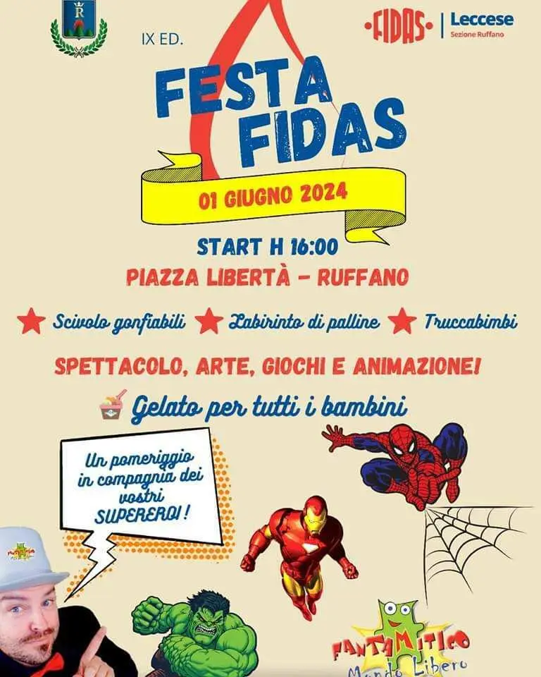 Ancora un grande evento per l'Associazione Giò Giò e i Supereroi che sabato 1 giugno, con inizio alle ore 16:00, sarà in Piazza Libertà a Ruffano in occasione della Festa Fidas con quattro supereroi: Wonder Woman, Captain America, Hulk e Spider Man pronti ad intrattenere grandi e piccini e scattare tante foto.