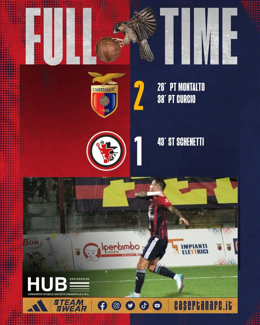 Casertana (4-3-3): Venturi; Calapai, Sciacca, Celiento, Anastasio; Matese, Proietti, Toscano; Tavernelli, Montalto (37’st. Cadili), Curcio. All. Cangelosi.