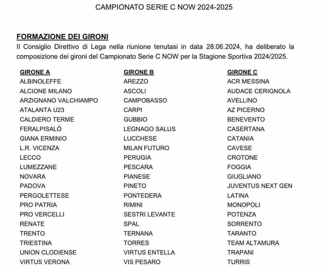 FOTONOTIZIA Ecco i tre gironi di serie C. Il Taranto pesca la Juventus Next Gen