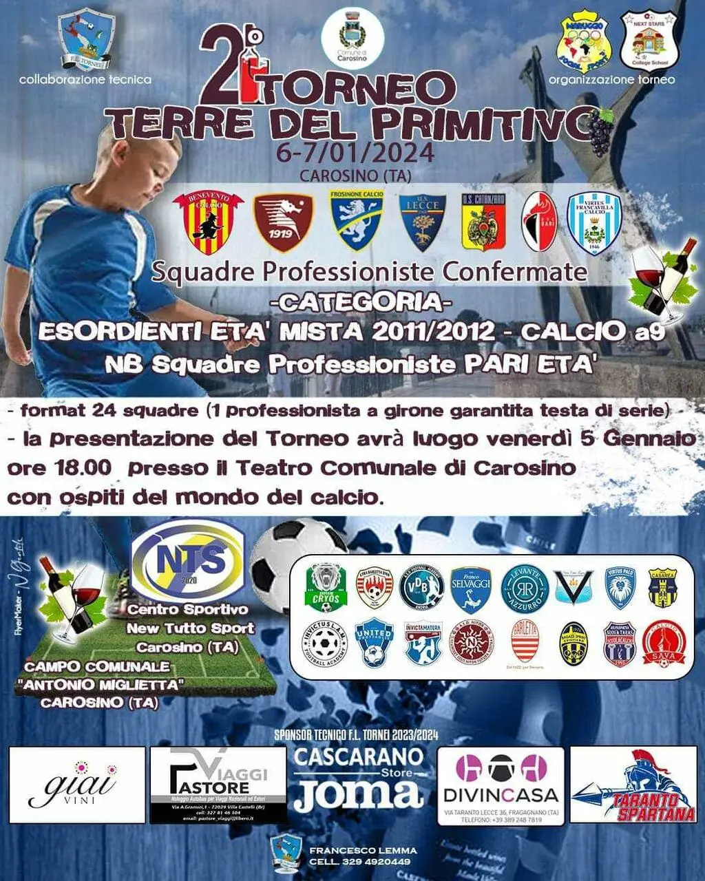 E’ tutto pronto per il Torneo Terre del Primitivo che si disputerà a Carosino il 6 e 7 gennaio (con presentazione il 5) in cui oltre alle tante squadre professioniste parteciperà anche la Nuova Taras con gli Esordienti 2012 di Angelo Cervino e quelli 2011 di Antonio Morea… “Si tratta di un torneo di altissimo livello – attacca il tecnico Cervino – in cui parteciperanno tante squadre professioniste come Lecce, Bari, Salernitana, Benevento, Catanzaro, Virtus Francavilla e altre. Vogliamo vedere a che punto stiamo dopo i primi quattro mesi di lavoro con l’obiettivo che resta quello della crescita dei ragazzi cercando, come sempre, di dire la nostra in una grande vetrina. Il girone? Incontreremo il Bari, la Nitor Brindisi e il Sava (esordio sabato mattina con il Sava), Ci tengo a ringraziare la presidenza che ci da ancora una volta una chance importante per far migliorare i ragazzi”.