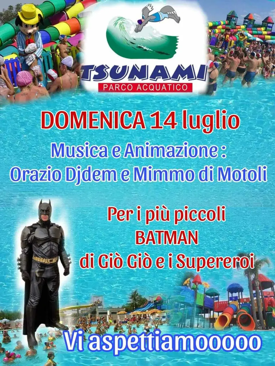 Ancora un grande appuntamento per Giò Giò e i Supereroi. Domenica 14 luglio Batman arriverà al Parco Acquatico “Tsunami” di Francavilla Fontana per animare un grande pomeriggio di divertimento e scattare foto con tutti i presenti. Non mancate ci sarà da divertirsi…