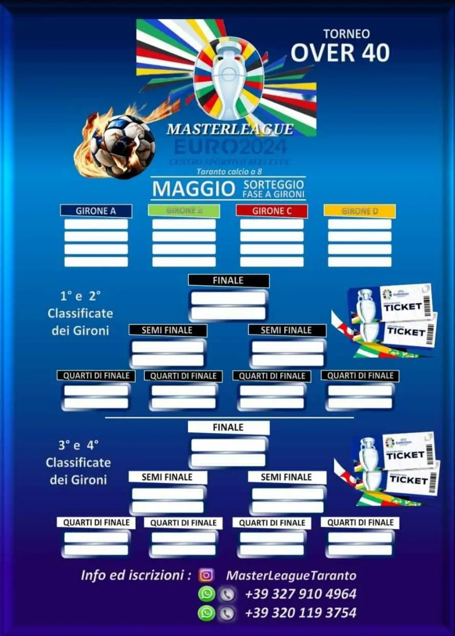 Sono ufficialmente aperte le iscrizioni per l’Europeo Over 40 (fino alla fine di maggio), altro bell’evento di calcio a 8 organizzato presso il Centro Sportivo “Belle Vue” da Gianluca Triuzzi e Andrea Forleo.