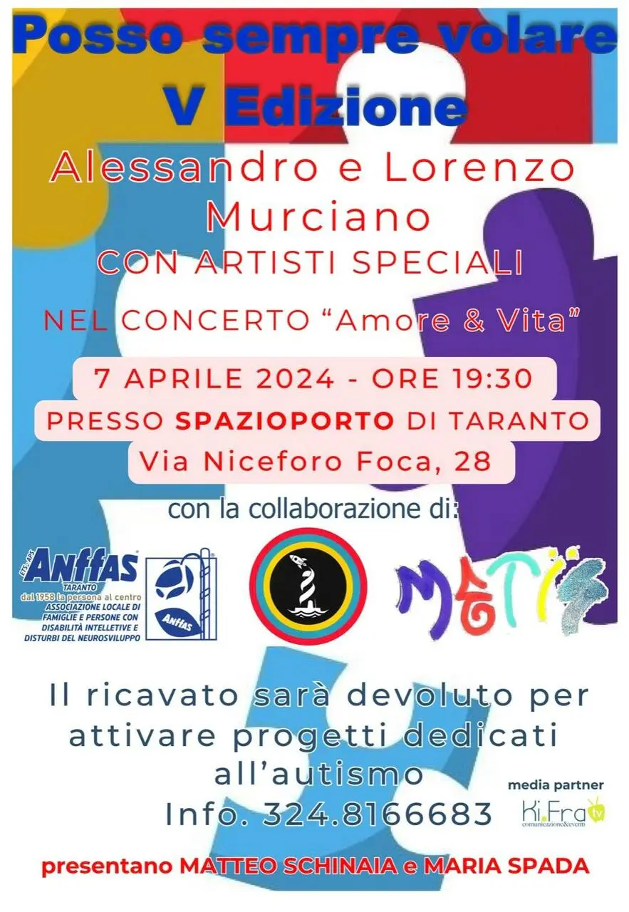 Tra gli eventi su questo tema a cui non mancare c'è la quinta edizione di "Posso sempre volare", concerto sul tema "Amore & Vita": appuntamento domenica 7 aprile alle 19:30 a Spazioporto, in via Niceforo Foca, 28 a Taranto, che ha concesso gratuitamente gli spazi per una serata indimenticabile.