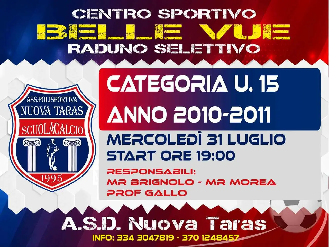 Ancora un raduno selettivo per la Nuova Taras. Mercoledì 31 luglio dalle 19, presso il Centro Sportivo “Belle Vue” la società del Presidente Coretti ne organizza uno per la categoria U15 e quindi nati nel 2010 e nel 2011. I ragazzi saranno seguiti con la solita grande professionalità dai tecnici Fabrizio Brignolo, Antonio Morea e dal Prof Gallo. Per maggiori info chiamare i numeri 3343047819 o il 3701248457.