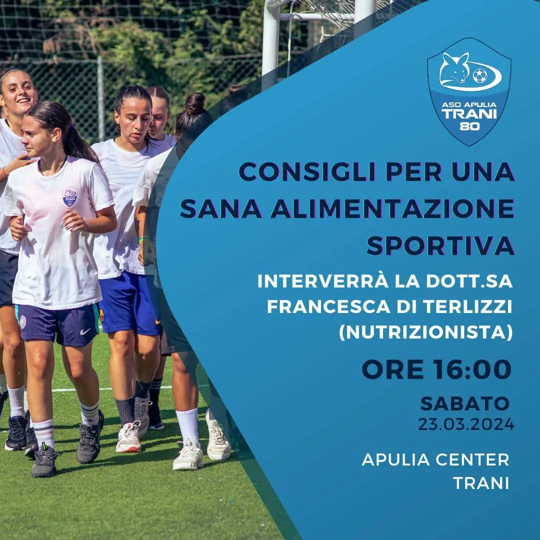 Sempre attiva nell'organizzazione di eventi utili per la crescita l'Apulia Trani. Di fatto sabato 23 marzo a partire dalle ore 16, presso l'Apulia Center, dopo quello già svolto una settimana fa riguardante il tema della tutela dei minori, si terrà un nuovo convegno sulla corretta alimentazione degli sportivi. A moderare l'evento e a tracciare utili consigli sul modo di nutrirsi per gli atleti sarà la Dott. ssa/Nutrizionista Francesca Di Terlizzi accompagnata dalla Responsabile del Settore Giovanile biancoazzurro Irene Spallucci.