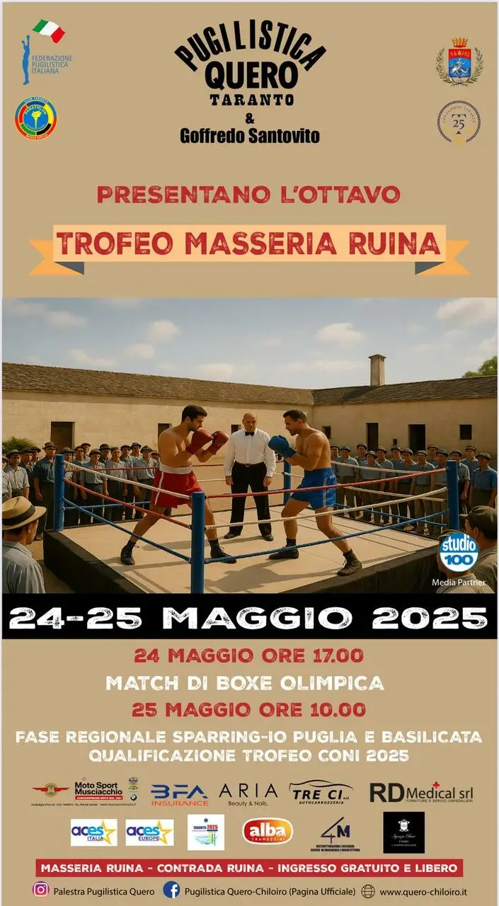 Il Trofeo Masseria Ruina, oltre all'appuntamento del 24 maggio, che partirà alle ore 17.00 con il primo gong dei match dilettantistici tra la Quero-Chiloiro e società provenienti da Puglia e Basilicata, proseguirà poi la mattina successiva di domenica 25 maggio con la fase regionale di sparring-io valevole come qualificazione al trofeo CONI 2025 che si terrà a settembre in Friuli-Venezia Giulia. La partecipazione a entrambi gli eventi è libera e gratuita.