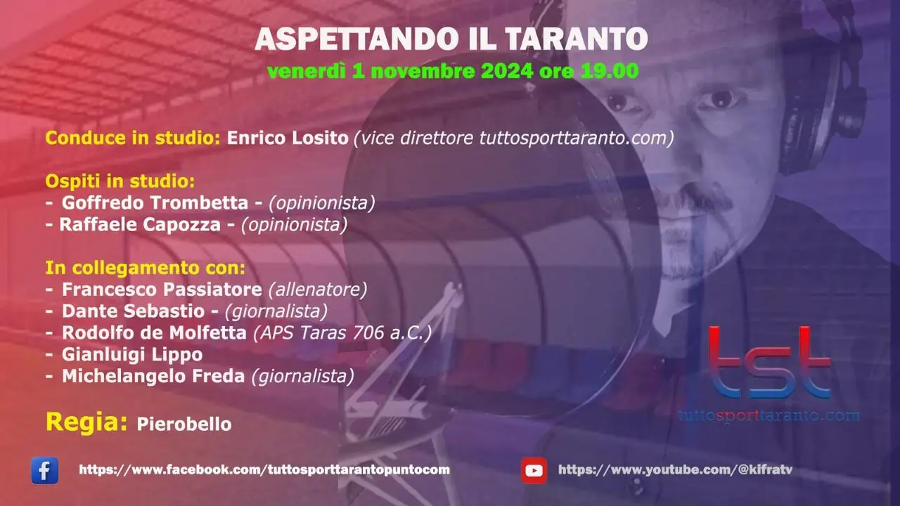Venerdì 1 novembre dalle ore 19:00, appuntamento con “ASPETTANDO IL TARANTO”, il contenitore sportivo a cura della redazione di Tutto Sport Taranto.com condotto da Enrico Losito con la regia di Piero Bello. Nel corso della puntata tratteremo le tematiche di stretta attualità del Taranto Fc 1927 in particolare della cessione societaria e della pesante sconfitta subita dai rossoblu a Potenza proiettandoci anche verso la gara Avelino-Taranto. Dagli studi della nostra redazione di Ki.Fra Tv avremo come ospiti della puntata: il nostro opinionista Goffredo Trombetta e il tifoso rossoblu Raffaele Capozza mentre in collegamento esterno ci saranno: l’allenatore Francesco Passiatore; il nostro Gianluigi Lippo; Rodolfo De Molfetta, presidente dell’Aps Taras 706 a.C.; Dante Sebastio, direttore di Blunote.it e da Avellino Michelangelo Freda, giornalista di Prima Tivvù. Vi aspettiamo in diretta sulle pagine ufficiali Facebook e Youtube di Tutto Sport Taranto e Ki.fra tv dalle ore 19:00 con le vostre domande, commenti e opinioni…NON MANCATE!!! Il contenitore sportivo è stato realizzato grazie al supporto di Ipersport in via per S. Giorgio Jonico km 10 (contrada Cimino) a Taranto; Elettrica Martino in Via De Cesare, 8/10 a Taranto; Studio Radiologico San Tommaso in via Luigi Settembrini, 232 a Talsano (TA); Studio Fornaro-Occhinegro dottori commercialisti associati, in Piazzale Dante, 8 a Taranto; in via Skanderbeg, 64 a Bari e in via Einaudi, 10 a Locorotondo (BA); Ottica Dierre in Corso Italia, 329/331 a Taranto; Birroteca Puglia in via Cataldo Nitti, 14 a Taranto; Erario Ottavio Srls – Costruzioni edilizie in via Don Minzoni, 2 a Manduria (TA), Guernica - cucina pizzeria tarantina in via Acclavio, 4-10 a Taranto, Peperoncino Rosso Trattoria, via S. Francesco 13/b a Statte (TA).