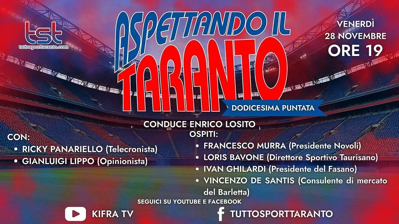 Venerdì 28 novembre dalle ore 19:00 in diretta dagli studi di Ki.fra Tv nuovo appuntamento con “ASPETTANDO IL TARANTO”, il contenitore sportivo a cura della redazione di Tutto Sport Taranto.com condotto da Enrico Losito, coadiuvato dal telecronista Ricky Panariello e dall’opinionista Gianluigi Lippo con la regia di Claudio Ingrosso. Nel corso della puntata tratteremo le tematiche di stretta attualità della SS Taranto Calcio e commenteremo l’ultima gara di campionato e la gara di Coppa Italia con il Novoli proiettandoci alla prossima gara in trasferta contro il Turisano. Ospiti in collegamento esterno ci saranno: Francesco Murra, presidente del Novoli; Loris Bavone, direttore sportivo del Taurisano; Ivan Ghilardi, presidente del Fasano e Vincenzo De Santis, consulente di mercato del Barletta. Vi aspettiamo in diretta sulle pagine ufficiali Facebook, Youtube e Twitch di Tutto Sport Taranto e Ki.fra tv dalle ore 19:00 con le vostre domande, commenti e opinioni…NON MANCATE!!! Il contenitore sportivo è stato realizzato grazie al supporto di Studio Fornaro-Occhinegro dottori commercialisti associati, in Piazzale Dante, 8 a Taranto; in via Skanderbeg, 64 a Bari e in via Einaudi, 10 a Locorotondo (BA); Erario Ottavio Srls – Costruzioni edilizie in via Don Minzoni, 2 a Manduria (TA); 101 Desideri Floreali, Via Lama, 120 a Lama (TA) cell. 389/5245740; Hotel Virgilio "Una Terrazza sul Mare " Viale Virgilio, 4 a Taranto tel. 099/4594116; Nolocar Srls , via Galeso, 355 a Taranto cell. 346/5075088; Headway Travel di Ascoli Annunziata, Piazza Vittorio Veneto, 3 a Palagiano (TA) tel. 099/6528083; Auto Zentrum Rent Car by Giuliani, sede di Mottola, via C.A.Dalla Chiesa, s.n.c.,tel.099/8051329; cell.388/4456544; 328/6130332; sede di Gioia del Colle via Giulio Pastore, 78; tel. 080/4729201; cell. 328/6130332. .