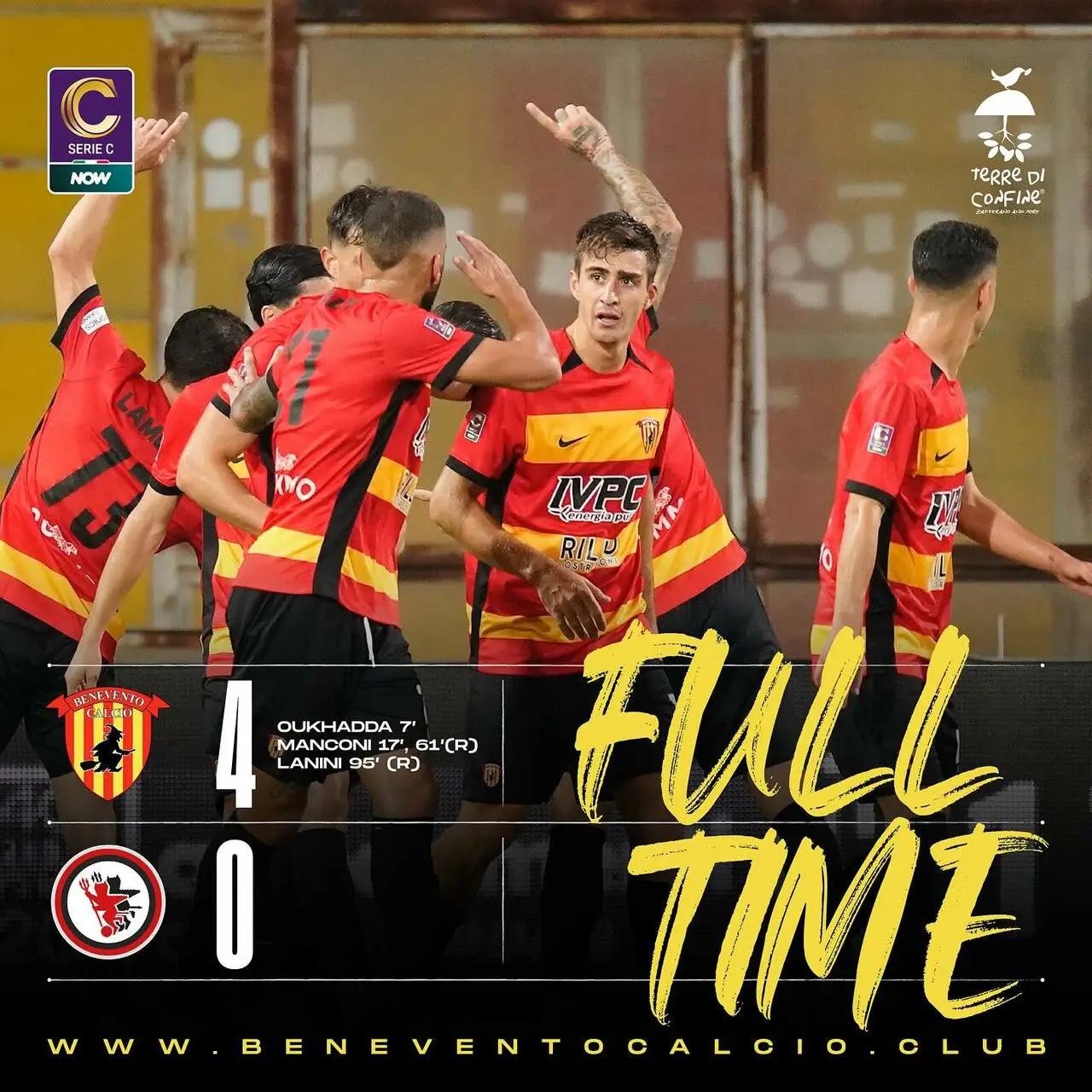 BENEVENTO (4-3-3): Nunziante; Oukhadda (dal 35’s.t. Sena), Berra (C), Tosca, Viscardi; Talia, Prisco (dal 24’s.t. Viviani), Simonetti (dal 24’s.t. Starita); Lamesta, Perlingieri (dal 21’s.t. Lanini), Manconi (dal 35’s.t. Agazzi). A disposizione: Manfredini, Lucatelli; Avolio, Ciurleo, Meccariello, Veltri; Carfora. All.: Gaetano Auteri.