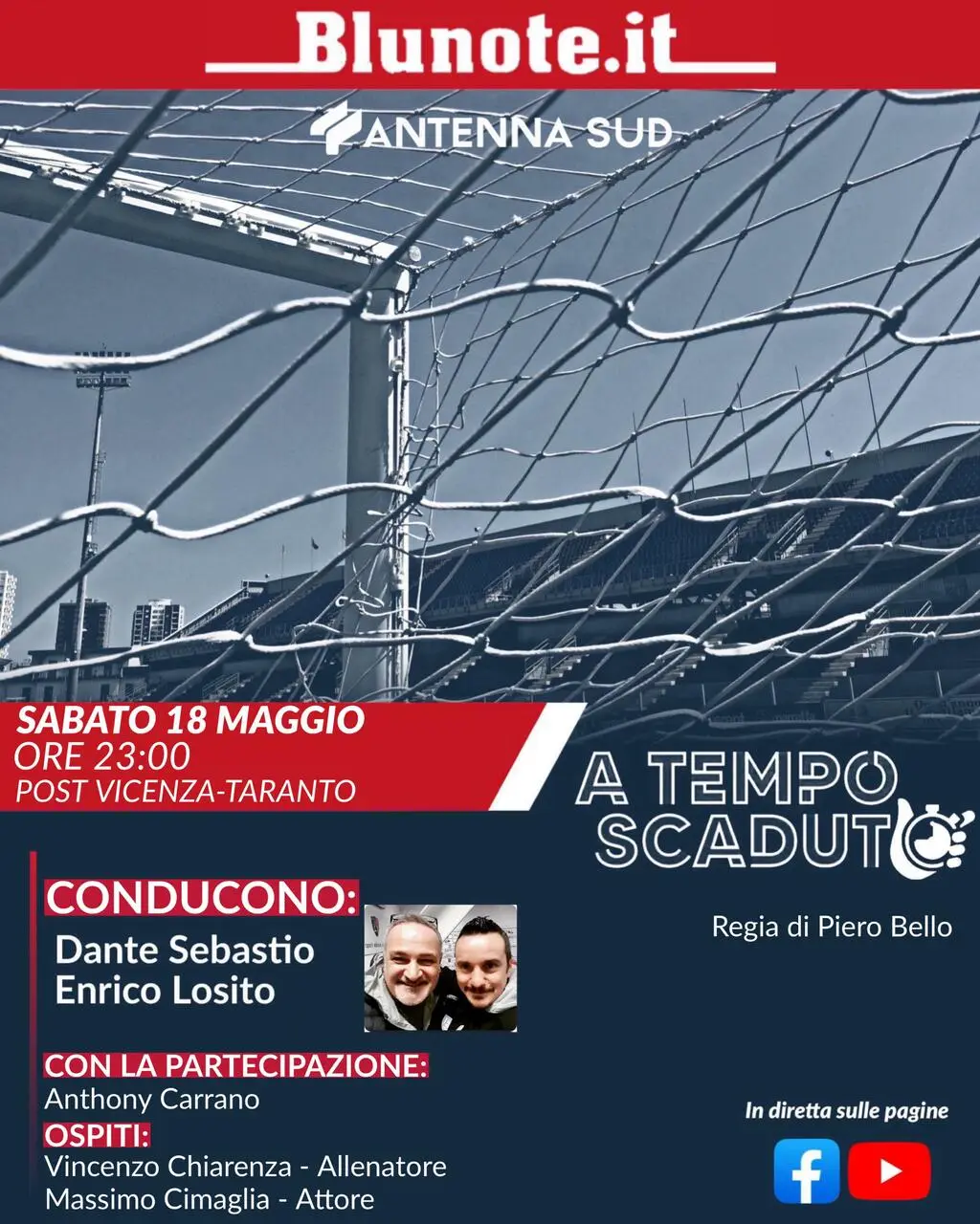 Sabato 18 maggio dalle ore 23:00, appuntamento con “A TEMPO SCADUTO”, il contenitore sportivo a cura della redazione di Blunote.it condotto da Dante Sebastio ed Enrico Losito con la partecipazione di Anthony Carrano. Commenteremo insieme la gara Vicenza-Taranto, 1^ turno nazionale dei play off – gara di ritorno, con il collegamento con Dante Sebastio che raccoglierà le dichiarazioni dei protagonisti in diretta dalla sala stampa dello stadio “Romero Menti” di Vicenza. Ospiti della puntata: Vincenzo Chiarenza, allenatore e doppio ex del confronto, e Massimo Cimaglia, attore, in qualità di opinionista. Vi aspettiamo in diretta sulle pagine ufficiali Facebook e Youtube di Blunote Web dalle ore 23:00! Il contenitore sportivo è stato realizzato grazie al supporto di Hotel Virgilio in Viale Virgilio, 4 a Taranto; Ipersport in via per S. Giorgio Jonico km 10 (contrada Cimino) a Taranto; Elettrica Martino in Via De Cesare, 8/10 a Taranto; Studio Radiologico San Tommaso in via Luigi Settembrini, 232 a Talsano (TA); Teatro Cinema Orfeo in via Pitagora, 98 a Taranto; Studio Fornaro-Occhinegro dottori commercialisti associati, in Piazzale Dante, 8 a Taranto; in via Skanderbeg, 64 a Bari e in via Einaudi, 10 a Locorotondo (BA); Studio Dentistico Sannelli Dr. Vito e Fabio Sannelli in viale Magna Grecia, 20 a Taranto, Ottica Dierre in Corso Italia, 329/331 a Taranto; Farmacia Galantino di Mauro e Carla in via Medaglie D’Oro, 19 a Taranto; CAFFE FADI, Coffee World by Coffee Break in via Dante Alighieri, 283 a Taranto e Onoranze Funebri “GLI ANGELI s.r.l.” H24 Attolino in via Monfalcone, 17 e in via C. Battisti, 90 a Taranto e in via V. Emanuele, 31/A a Leporano.