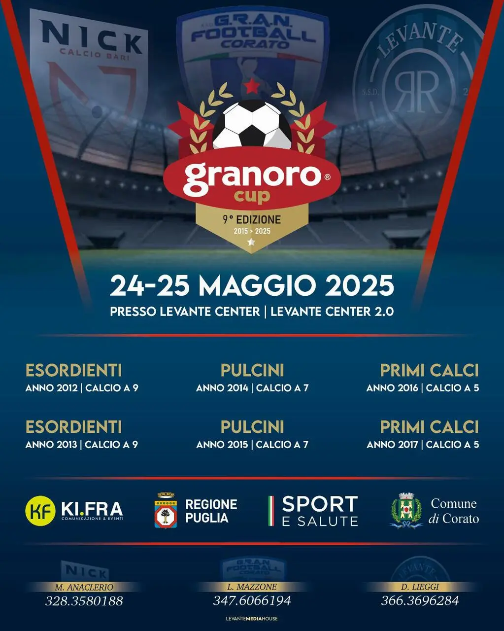 Organizzato da Gran Football Corato, Nick Calcio Bari e Levante Azzurro e patrocinato da enti prestigiosi come la Regione Puglia, Sport e Salute e il Comune di Corato, la Granoro Cup si propone di superare il successo delle edizioni precedenti.