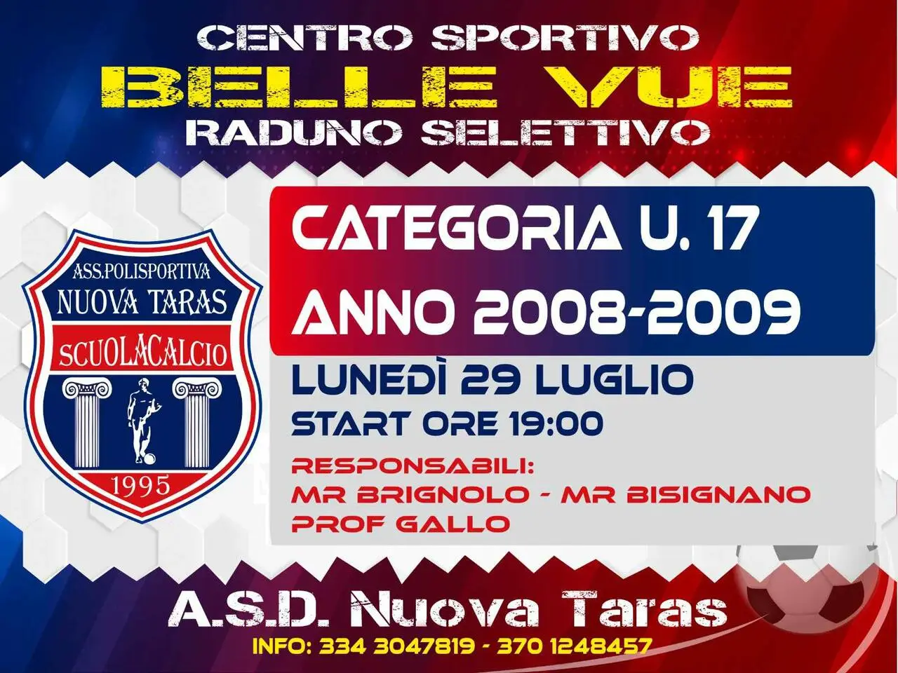 In casa Nuova Taras si torna in campo per un nuovo raduno selettivo. Lunedì 29 luglio a partire dalle ore 19 presso il Centro Sportivo “Belle Vue” la società del Presidente Ettore Coretti ne terrà uno per la categoria U17 e quindi per ragazzi nati nel 2008 e nel 2009. I giovani atleti saranno seguiti e osservati dai preparati tecnici Fabrizio Brignolo, Maurizio Bisignano e dal prof Gallo. Per maggiori info chiamare il numero 3343047819 o il 3701248457.