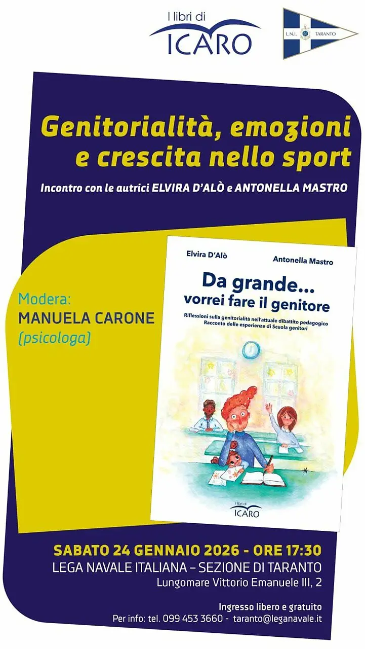 Genitorialità, emozioni e crescita nello sport. La Lega Navale Italiana Sezione di Taranto ospiterà, presso la propria sede situata su Lungomare Vittorio Emanuele III n. 2 , sabato 24 gennaio (con inizio alle ore 17:30) un incontro dedicato al rapporto tra famiglia, sviluppo emotivo e sport, a partire dalla presentazione del libro “Da grande… vorrei fare il genitore” di Elvira D’Alò e Antonella Mastro.