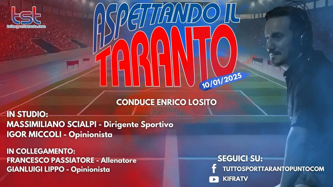 Venerdì 10 gennaio dalle ore 19:00 in diretta dagli studi della nostra redazione di Ki.Fra Tv, appuntamento con “ASPETTANDO IL TARANTO”, il contenitore sportivo a cura della redazione di Tutto Sport Taranto.com condotto da Enrico Losito con la regia di Claudio Ingrosso. Nel corso della puntata tratteremo le tematiche di stretta attualità del Taranto Fc 1927, in avremo Massimiliano Scialpi, dirigente sportivo e l’opinionista Igor Miccoli mentre in collegamento ci saranno: l’allenatore Francesco Passiatore e il nostro Gianluigi Lippo. Vi aspettiamo in diretta sulle pagine ufficiali Facebook e Youtube di Tutto Sport Taranto e Ki.fra tv dalle ore 19:00 con le vostre domande, commenti e opinioni…NON MANCATE!!! Il contenitore sportivo è stato realizzato grazie al supporto di Ipersport in via per S. Giorgio Jonico km 10 (contrada Cimino) a Taranto; Studio Radiologico San Tommaso in via Luigi Settembrini, 232 a Talsano (TA); Studio Fornaro-Occhinegro dottori commercialisti associati, in Piazzale Dante, 8 a Taranto; in via Skanderbeg, 64 a Bari e in via Einaudi, 10 a Locorotondo (BA); Ottica Dierre in Corso Italia, 329/331 a Taranto; Birroteca Puglia in via Cataldo Nitti, 14 a Taranto; Erario Ottavio Srls – Costruzioni edilizie in via Don Minzoni, 2 a Manduria (TA), Guernica - cucina pizzeria tarantina in via Acclavio, 4-10 a Taranto, Peperoncino Rosso Trattoria, via S. Francesco 13/b a Statte (TA).