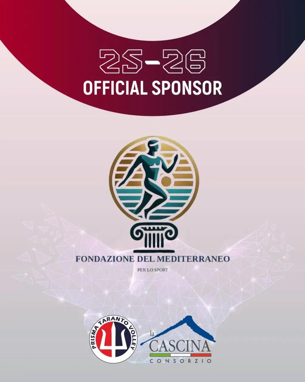 La Fondazione del Mediterraneo per lo Sport, realtà tarantina promossa dal Commissario Straordinario Fondazione Giochi del Mediterraneo Taranto 2026 dott. Massimo Ferrarese, impegnata nella promozione e nel rilancio dello sport di base e agonistico, rappresentata dal Presidente avv. Angelo Buonfrate con i consiglieri dott. Andrea Masciandaro e l’avv. Maurizio Lasalvia, nonché tutti i sostenitori dell’iniziativa, affiancherà la Prisma La Cascina Taranto Volley nel corso della stagione, condividendo obiettivi e visione di sviluppo per il territorio.