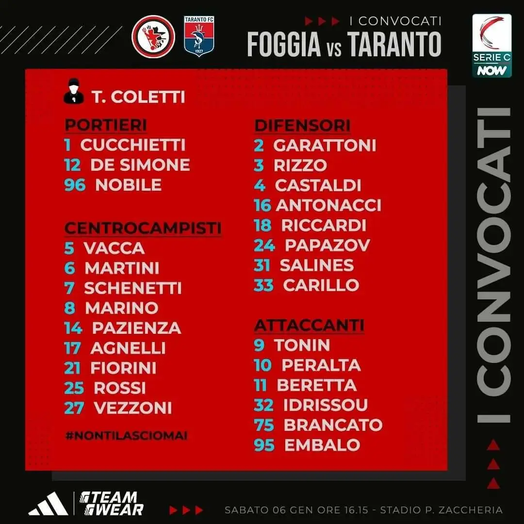 FOTONOTIZIA Foggia: i convocati per la sfida con il Taranto
