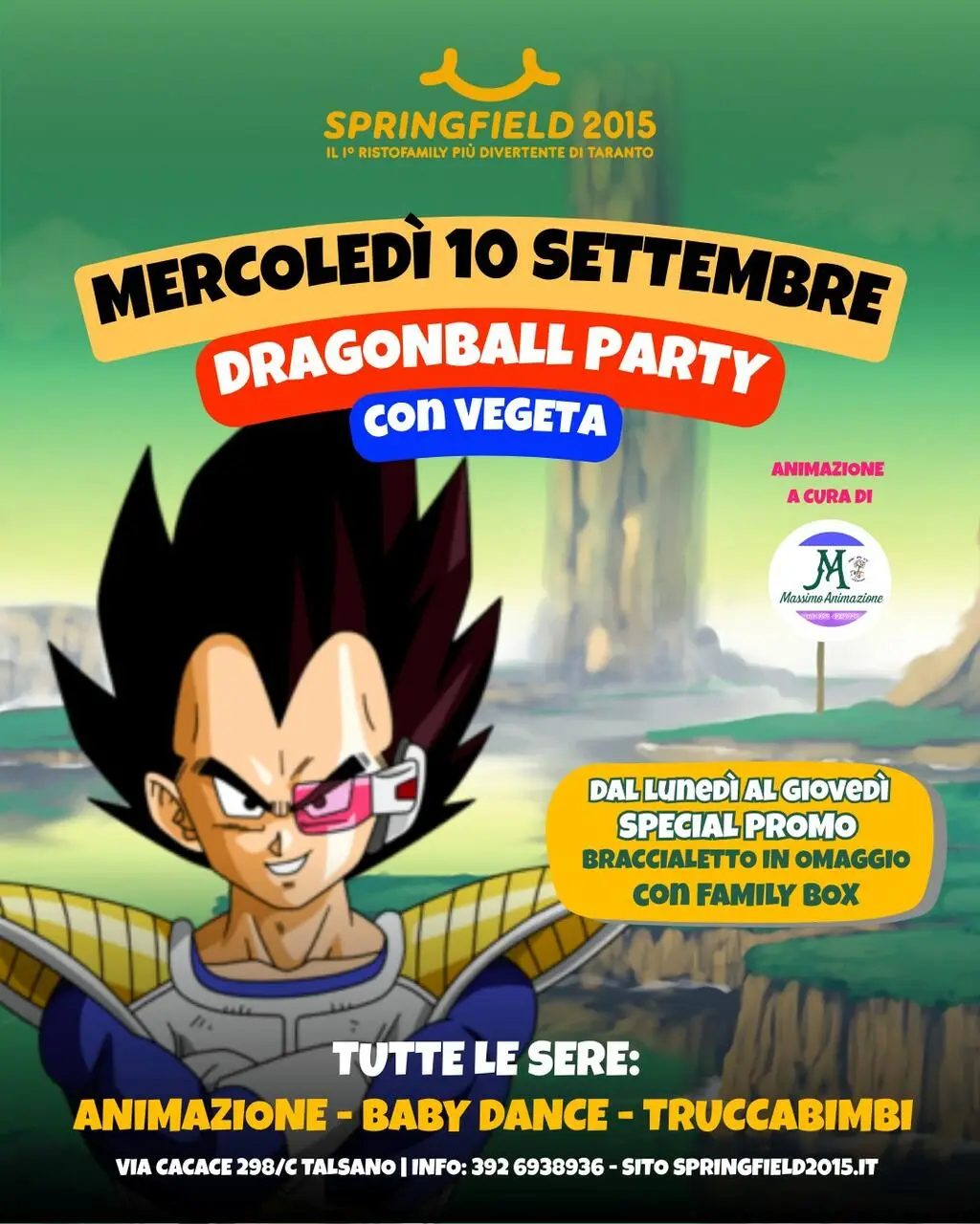 Presso Springfield 2015 si prospetta ancora un grande mercoledì (10 settembre) con i personaggi dell'Associazione Giò Giò e i Supereroi. In occasione del Dragon Ball Party, al rinomato locale di Talsano atterrerà Vegeth che renderà la serata ancora più unica con foto e tanto divertimento. Non mancate…