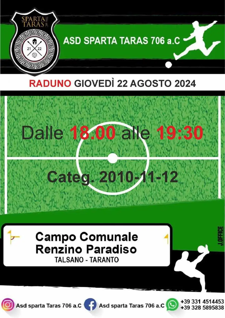 Si torna in campo anche in casa Sparta Taras: giovedì 22 agosto a partire dalle ore 18 fino alle 19:30 a Talsano ci sarà un nuovo raduno per bambini nati nel 2010, nel 2011 e nel 2012. Questo sarà seguito dagli occhi vigili del tecnico Marco Casula. Per maggiori info contattare i numeri 3314514453 o 3285895838.