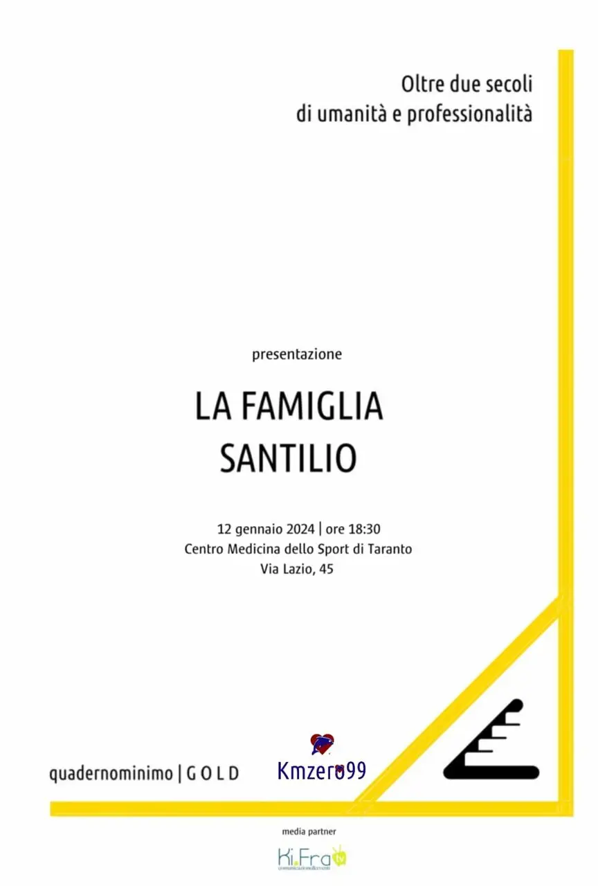 "La Famiglia Santilio - Storia e racconto di una famiglia e di una vocazione" sarà presentato infatti domani alle ore 18:30 al Centro Medicina dello Sport di Taranto, in via Lazio, 45.