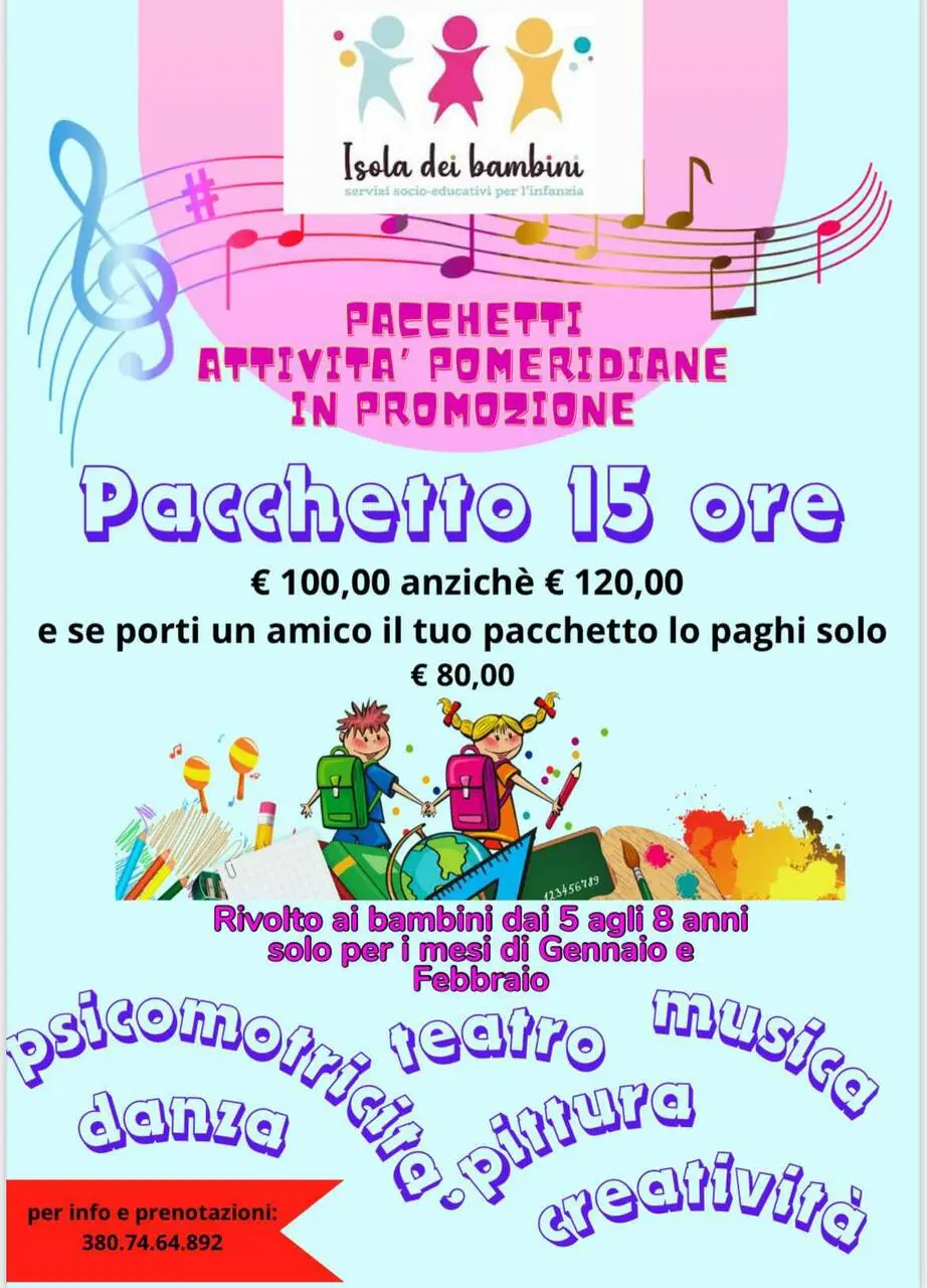 Solo per i mesi di gennaio e febbraio per i bambini dai cinque agli otto anni il pacchetto di 15 ore sarà scontato da 120 euro a 100 euro e se porti un amico il tuo pacchetto lo pagherai soltanto 80 euro. Ciò riguarda i laboratori di puttura, danza, psicomotricità, musica, teatro e creatività. Per maggiori info chiamare il 3807464892.