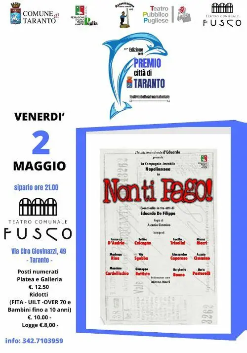 Il cartellone organizzato dal direttore artistico Lino Conte prosegue con la Compagnia Napolinscena e l'immortale "Non ti pago" di Eduardo De Filippo, con la regia di Ascanio Cimmino. L’appuntamento è fissato per venerdì 2 maggio alle ore 21 sul palcoscenico del Teatro Comunale Fusco.
