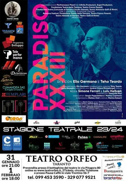 Lo spettacolo rientra nella stagione 2023/2024 “Taranto, i più grandi passano da qui” del Teatro Orfeo. Partner ufficiali: Regione Puglia, Comune di Taranto, Programma Sviluppo, Teleperformance Italia e Immobiliare De Bartolomeo. Per informazioni, abbonamenti e biglietti: 099 4533590 – 3290779521 Online su: 2Tickets e TicketOne. www.teatrorfeo.it - [email protected]