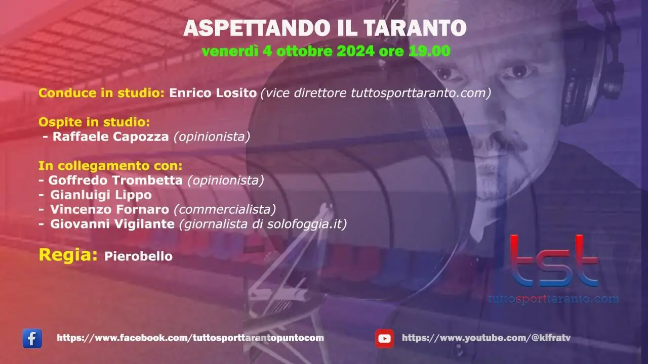 Venerdì 4 ottobre dalle ore 19:00, appuntamento con “ASPETTANDO IL TARANTO”, il contenitore sportivo a cura della redazione di Tutto Sport Taranto.com condotto da Enrico Losito con la regia di Piero Bello. Nel corso della puntata tratteremo le tematiche di stretta attualità del Taranto Fc 1927 dall’eventuale cessione societaria e degli scenari futuri di bilancio del Club proiettandoci anche verso il derby Foggia-Taranto. Dagli studi della nostra redazione di Ki.Fra Tv avremo come ospite della puntata: Raffaele Capozza in qualità di opinionista, in collegamento esterno i nostri Goffredo Trombetta e Gianluigi Lippo, il commercialista Vincenzo Fornaro e da Foggia Giovanni Vigilante , giornalista di SoloFoggia.it . Vi aspettiamo in diretta sulle pagine ufficiali Facebook e Youtube di Tutto Sport Taranto. dalle ore 19:00 con le vostre domande, commenti e opinioni…NON MANCATE!!! Il contenitore sportivo è stato realizzato grazie al supporto di Ipersport in via per S. Giorgio Jonico km 10 (contrada Cimino) a Taranto; Elettrica Martino in Via De Cesare, 8/10 a Taranto; Studio Radiologico San Tommaso in via Luigi Settembrini, 232 a Talsano (TA); Studio Fornaro-Occhinegro dottori commercialisti associati, in Piazzale Dante, 8 a Taranto; in via Skanderbeg, 64 a Bari e in via Einaudi, 10 a Locorotondo (BA); Ottica Dierre in Corso Italia, 329/331 a Taranto; Onoranze Funebri “GLI ANGELI s.r.l.” H24 Attolino in via Monfalcone, 17 e in via C. Battisti, 90 a Taranto e in via V. Emanuele, 31/A a Leporano, Viva La Puglia – il primo villaggio itinerante pugliese della Potenza Srl con sedi in via Vittorio Emanuele, 116 a Ginosa (TA) e in via Fattori, 75 a Torino, Bittoreca Puglia in via Cataldo Nitti, 14 a Taranto; Erario Ottavio Srls – Costruzioni edilizie in via Don Minzoni, 2 a Manduria (TA), Guernica - cucina pizzeria tarantina in via Acclavio, 4-10 a Taranto, Peperoncino Rosso Trattoria, via S. Francesco 13/b a Statte (TA).