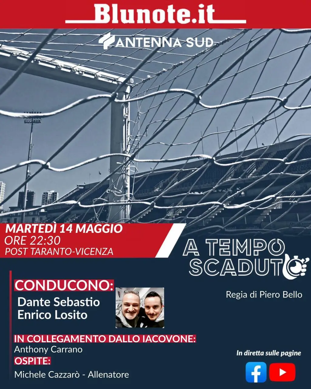 Martedì 14 maggio dalle ore 22:30, appuntamento con “A TEMPO SCADUTO”, il contenitore sportivo a cura della redazione di Blunote.it condotto da Dante Sebastio ed Enrico Losito. Commenteremo insieme la gara Taranto-Vicenza, 1^ turno nazionale dei play off, con il nostro Anthony Carrano che raccoglierà le dichiarazioni dei protagonisti in diretta dalla sala stampa dello stadio “Erasmo Iacovone”. Ospite della puntata: Michele Cazzaro, ex allenatore e calciatore dei rossoblu. Vi aspettiamo in diretta sulle pagine ufficiali Facebook e Youtube di Blunote Web dalle ore 22:30! Il contenitore sportivo è stato realizzato grazie al supporto di Hotel Virgilio in Viale Virgilio, 4 a Taranto; Ipersport in via per S. Giorgio Jonico km 10 (contrada Cimino) a Taranto; Elettrica Martino in Via De Cesare, 8/10 a Taranto; Studio Radiologico San Tommaso in via Luigi Settembrini, 232 a Talsano (TA); Teatro Cinema Orfeo in via Pitagora, 98 a Taranto; Studio Fornaro-Occhinegro dottori commercialisti associati, in Piazzale Dante, 8 a Taranto; in via Skanderbeg, 64 a Bari e in via Einaudi, 10 a Locorotondo (BA); Studio Dentistico Sannelli Dr. Vito e Fabio Sannelli in viale Magna Grecia, 20 a Taranto, Ottica Dierre in Corso Italia, 329/331 a Taranto; Farmacia Galantino di Mauro e Carla in via Medaglie D’Oro, 19 a Taranto; CAFFE FADI, Coffee World by Coffee Break in via Dante Alighieri, 283 a Taranto e Onoranze Funebri “GLI ANGELI s.r.l.” H24 Attolino in via Monfalcone, 17 e in via C. Battisti, 90 a Taranto e in via V. Emanuele, 31/A a Leporano.