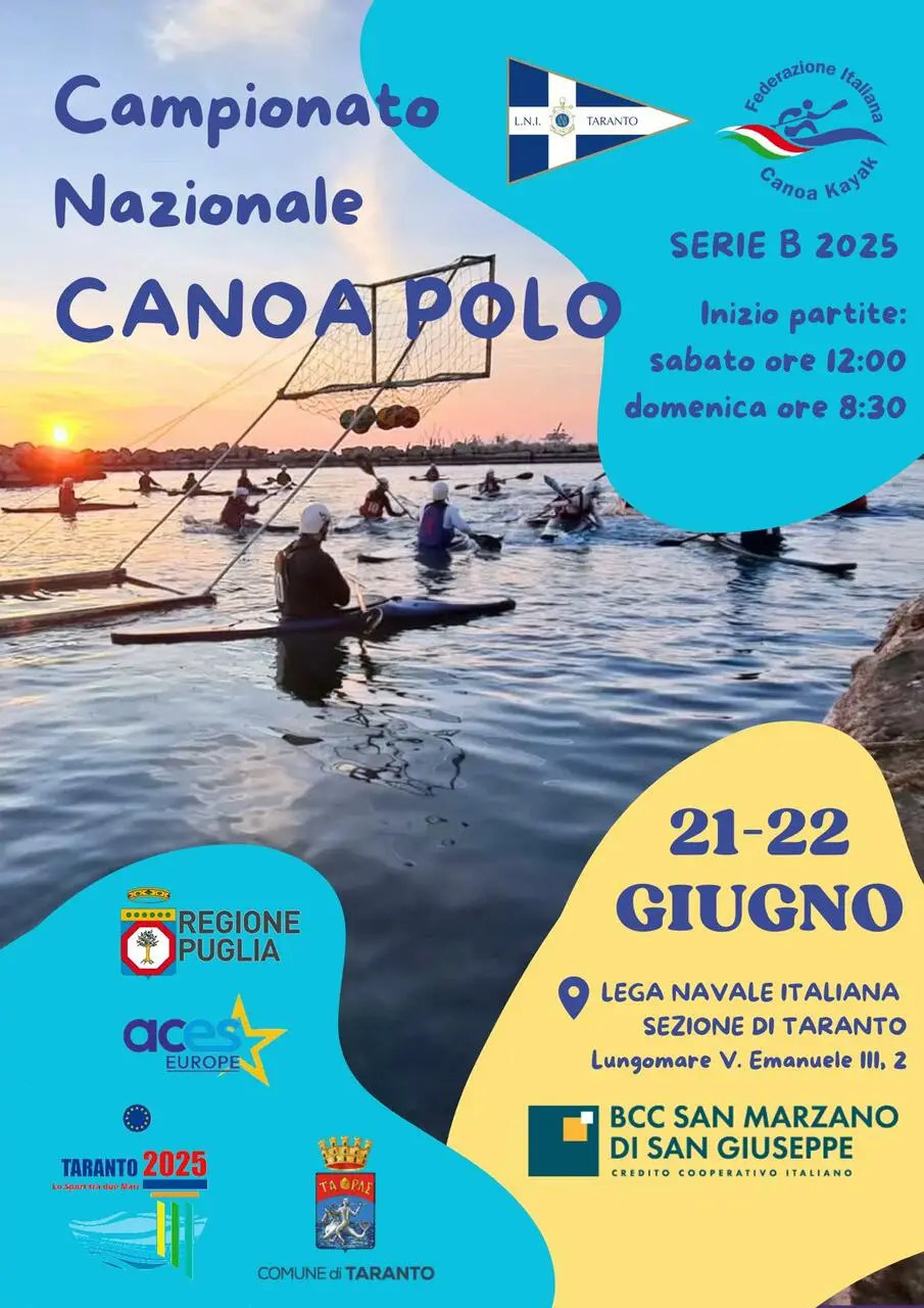 Un altro grande evento avrà come protagonista la Lega Navale Italiana Sezione di Taranto che sabato 21 e domenica 22 giugno ospiterà la 1^ giornata d'andata (la 2^ si giocherà a Bacoli il prossimo 12 e 13 luglio) del campionato nazionale di serie B 2025 di Canoa polo. L'evento sportivo organizzato dalla Federazione Italiana Canoa e Kayak vedrà confrontarsi nello specchio d'acqua antistante la sede della LNI ionica 7 squadre (composte da 5 elementi titolari) provenienti da diverse regioni d'Italia compresi i padroni di casa della LNI sez Taranto guidati da coach Gianni Romanazzi. La formula prevede un girone all'italiana con le gare che saranno disputate nella giornata di sabato 21 giugno (inizio gare ore 12.00) e domenica 22 giugno (inizio ore 8:30). Oltre alla squadra della LNI tarantina scenderanno i acqua le squadre della Canottieri Ichnusa di Cagliari, Canoa Club Cagliari , Jonica Canoa Polo Catania, Canoa Polo Ortigia, Canottieri Jonica Catania e Canoa Polo Club Siracusa. Palpabile l'entusiamo di coach Gianni Romanazzi della LNI sez Taranto in vista dell'esordio in campionato:"Anche quest'anno la Federazione Italiana Canoa ha scelto Taranto, città del mare e dello sport a livello europeo e dei Giochi del Mediterraneo, per svolgere questa importante tappa del campionato di canoa polo. Ci saranno 7 squadre a fronteggiarsi in acqua in sfide da 5 contro 5. Vi aspettiamo alla Lega Navale sabato e domenica per sostenere la nostra squadra che è bene ricordarlo rappresenta Taranto...Forza Taranto!"