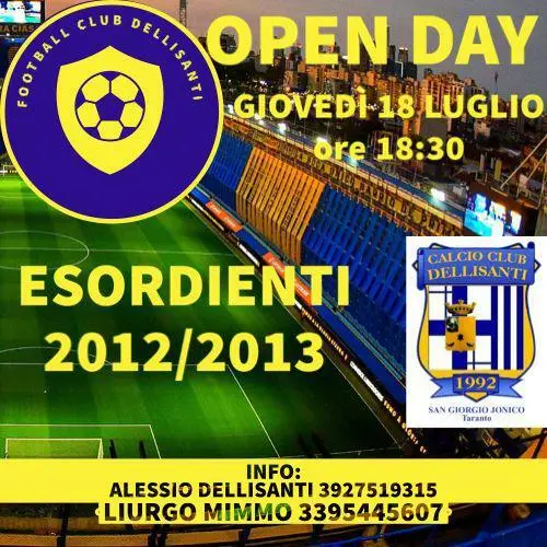 E' ancora tempo di Open Day in casa Calcio Club Dellisanti. La società sangiorgese ne organizza uno per giovedì 18 luglio dalle ore 18:30 per Esordienti nati nel 2012 e nel 2013. Questo si svolgerà presso il Centro Sportivo “Dellisanti”. Per maggiori info chiamare Alessio Dellisanti al 3927519315 o Mimmo Liurgo al 3395445607.