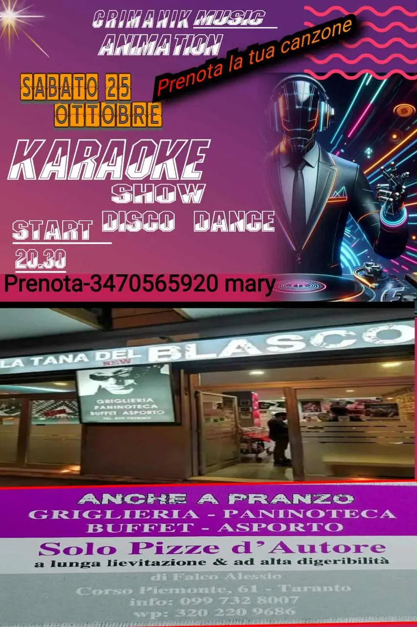 Un grande evento sabato 25 ottobre presso La Tana del Blasco, rinomata pizzeria (anche a pranzo) sita in Corso Piemonte 61 ((0997328007/3202209686) di Alessio Falco. Di fatto a partire dalle ore 20:30 i presenti si potranno divertirsi con il karaoke per una serata tra buon cibo e tante risate. Per info e prenotazioni chiamare il 3470565920.
