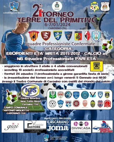 Cresce l’attesa per la seconda edizione del torneo “Terre del Primitivo, competizione calcistica riservata alla categoria esordienti (classi 2011 e 2012) che si svolgerà tra il 6 ed il 7 gennaio 2024 a Carosino. Le gare (39 in tutto) si disputeranno sui campi del centro sportivo Tuttosport ed al “Miglietta” e coinvolgeranno ben 24 società, di cui ben 8 professionistiche. Ad organizzare la manifestazione La Maruggio Social Sport ed F.L tornei in collaborazione con l’ex DS del Foggia Piergiuseppe Sapio, originario proprio di Carosino:“Siamo davvero entusiasti di avere messo in piedi una manifestazione di tale portata insieme all’amico Francesco Lemma – ha commentato Sapio, ideatore del torneo - perché rappresenta un importante veicolo di promozione per il nostro territorio, la terra del Primitivo. Oltre alle finalità meramente agonistico-sportive, il torneo mira a veicolare ancora di più il brand turistico che questo versante della provincia jonica ormai sta consolidando con il passare degli anni. In tanti, nei giorni di gare, avranno la possibilità di assaggiare il nostro vino – ha precisato Sapio - in quanto saranno allestiti degli stand ad hoc. Io sono stato sempre un assertore e sostenitore del calcio come strumento di crescita sociale oltre che culturale e sportiva. Dal punto di vista strettamente agonistico – ha concluso Sapio - posso preannunciare che il livello tecnico sarà certamente molto interessante. Che vinca il migliore”. Le gare si svolgeranno nei giorni 6 e 7 gennaio 2024 e coinvolgeranno le seguenti società: Lecce, Sassuolo, Frosinone, Salernitana, Bari, Catanzaro, Virtus Francavilla, Benevento, Nuova Taras, Giovani Cryos, United Grottaglie, Barletta 1922, Virtus Palo, Virtus calcio Foggia, Sava calcio, Etra Barletta, Football Academy Andria, Nitor Brindisi, Invicta Matera, Real Cesarea, ragazzi Sprint Crispiano, Levante Azzurro, Invictus Iam, Franco Selvaggi. Il regolamento prevede che le compagini si affrontino in 6 gironi da 4 squadre. Le prime due classificate daranno vita agli ottavi di finale, dal cui momento le sfide saranno ad eliminazione diretta sino ad arrivare alla finale di domenica 7 gennaio che decreterà la squadra vincitrice.