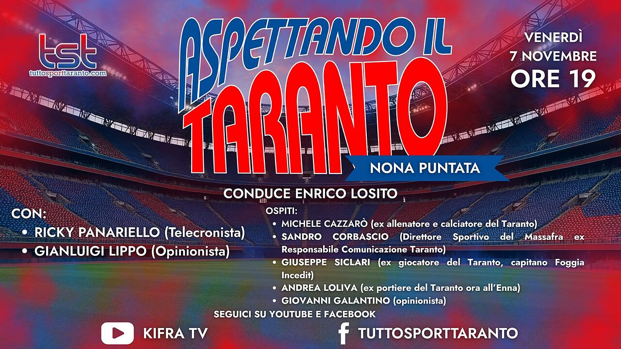 Venerdì 7 novembre dalle ore 19:00 in diretta dagli studi di Ki.fra Tv nuovo appuntamento con “ASPETTANDO IL TARANTO”, il contenitore sportivo a cura della redazione di Tutto Sport Taranto.com condotto da Enrico Losito, coadiuvato dal telecronista Ricky Panariello e dall’opinionista Gianluigi Lippo con la regia di Claudio Ingrosso. Nel corso della puntata tratteremo le tematiche di stretta attualità della SS Taranto Calcio commenteremo le ultime gare di campionato con il Canosa e il Massafra proiettandoci alla prossima trasferta contro il Foggia Incedit. Ospite in studio: Giovanni Galantino, in qualità di opinionista in collegamento esterno ci saranno: Michele Cazzarò, ex allenatore e calciatore del Taranto; Sandro Corbascio, direttore sportivo del Massafra ed ex responsabile della comunicazione del Taranto; Giuseppe Siclari, ex attaccante del Taranto attualmente capitano del Foggia Incedit e Andrea Loliva, ex portiere del Taranto ora all’Enna. Vi aspettiamo in diretta sulle pagine ufficiali Facebook, Youtube e Twich di Tutto Sport Taranto e Ki.fra tv dalle ore 19:00 con le vostre domande, commenti e opinioni…NON MANCATE!!! Il contenitore sportivo è stato realizzato grazie al supporto di Studio Fornaro-Occhinegro dottori commercialisti associati, in Piazzale Dante, 8 a Taranto; in via Skanderbeg, 64 a Bari e in via Einaudi, 10 a Locorotondo (BA); Erario Ottavio Srls – Costruzioni edilizie in via Don Minzoni, 2 a Manduria (TA); 101 Desideri Floreali, Via Lama, 120 a Lama (TA) cell. 389/5245740; Hotel Virgilio "Una Terrazza sul Mare " Viale Virgilio, 4 a Taranto tel. 099/4594116; Nolocar Srls , via Galeso, 355 a Taranto cell. 346/5075088; Headway Travel di Ascoli Annunziata, Piazza Vittorio Veneto, 3 a Palagiano (TA) tel. 099/6528083; Auto Zentrum Rent Car by Giuliani, sede di Mottola, via C.A.Dalla Chiesa, s.n.c.,tel.099/8051329; cell.388/4456544; 328/6130332; sede di Gioia del Colle via Giulio Pastore, 78; tel. 080/4729201; cell. 328/6130332.
