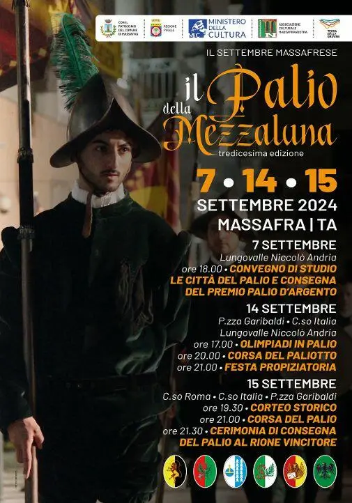 MASSAFRA – Dopo un lungo stop torna a Massafra il “Settembre massafrese” con il “Palio della Mezzaluna”, manifestazione organizzata dall’associazione culturale “MassafraNostra” con il patrocinio di Comune di Massafra, Terra delle Gravine, Regione Puglia e Ministero della Cultura. Il “Settembre massafrese”, giunto quest’anno alla tredicesima edizione, è incentrato sulla rievocazione storica della battaglia contro i turchi del 1594. L’archivio dell’insigne collegiata di San Lorenzo Martire conserva una nota redatta dal sacrista don Giovanni Cordola il quale, in calce al registro dei battezzati, registrava quanto accaduto con dovizia di dettagli. Al centro del racconto l’armata turca che assediò l’isola di Taranto per otto giorni, gli assedi quotidiani al fiume Tara e non solo, l’assalto a “piantata Scardino” dove risiedeva il vescovo di Mottola Jacopo Micheli, la gente di Massafra che cercò rifugio altrove, la ritirata dell’armata turca ormai sconfitta. Ad aprire il “Settembre massafrese” sarà il convegno di studio “Le città del palio” in programma il 7 settembre prossimo alle 18 incorniciato dal Lungovalle Niccolò Andria. Al termine dei lavori spazio alla consegna del “Palio d’argento”, prestigioso riconoscimento disegnato dal compianto artista Nicola Andreace che sarà assegnato a personalità operanti sul territorio ionico distintesi per la promozione della città in ambito culturale, imprenditoriale, sportivo e sociale. Si entrerà nel vivo il 14 settembre quando a partire dalle 17 in piazza Garibaldi, ponte Garibaldi e lungovalle Niccolò Andria si svolgeranno le “Olimpiadi in palio” ovvero una serie di giochi che costituiranno avvincenti sfide. L’esito delle “Olimpiadi in palio” decreterà l’ordine di sfilata dei rioni nel corso del corteo storico. A tal proposito va precisato che il primo classificato sarà l’ultimo rione a sfilare, occuperà il posto d’onore davanti al carroccio che trasporta il Palio. Alle 20 la corsa del “Paliotto”, la staffetta dedicata ai bambini che farà pregustare la sfida in programma il giorno seguente. Alle 21 tra piazza Garibaldi e corso Italia si terrà la consueta “Festa propiziatoria”, momento di festa mediante il quale si augurerà la vittoria ai migliori. Il 15 settembre, data attesissima, alle 19:30 partirà il corteo storico con figuranti in costumi d’epoca tra cui il vescovo Jacopo Micheli e la nobildonna Isabella Monsorio. Dopo il suggestivo tuffo nel passato, al rientro del corteo in Piazza Garibaldi sono previsti gli interventi delle autorità e, davanti alla tribuna d’onore, il giuramento dei capitani. Alle 21, la corsa a staffetta vedrà protagonisti gli atleti rappresentanti i sei rioni cittadini, quattro per ognuno di cui una donna. Il percorso si snoderà lungo un tracciato urbano ad anello che partirà da piazza Garibaldi e proseguirà per via Caduti della Nave Roma, ponte Garibaldi, corso Italia fino all’inversione per il ritorno in prossimità di piazza Vittorio Emanuele. In chiusura, alle 21:30 in piazza Garibaldi, la cerimonia di consegna del Palio al quartiere vincitore. Per l’edizione 2024, l’ambito drappo è stato dipinto dall’artista Francesco Lisi. Massafra è dunque pronta a vivere l’atteso ritorno del “Settembre massafrese” e ad accogliere quanti vorranno immergersi nel passato.