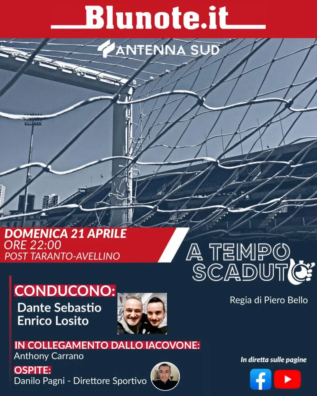 Domenica 21 aprile dalle ore 22:00, appuntamento con “A TEMPO SCADUTO”, il contenitore sportivo a cura della redazione di Blunote.it condotto da Dante Sebastio ed Enrico Losito in collegamento dallo stadio “E. Iacovone” di Taranto ci sarà il nostro Anthony Carrano che raccoglierà le dichiarazioni dei protagonisti nel post gara di Taranto-Avellino che commenteremo insieme ai vostri messaggi. Ospite della puntata: Danilo Pagni, direttore sportivo. Vi aspettiamo in diretta sulle pagine ufficiali Facebook e Youtube di Blunote Web dalle ore 22:00! Il contenitore sportivo è stato realizzato grazie al supporto di Hotel Virgilio in Viale Virgilio, 4 a Taranto; Ipersport in via per S. Giorgio Jonico km 10 (contrada Cimino) a Taranto; Elettrica Martino in Via De Cesare, 8/10 a Taranto; Studio Radiologico San Tommaso in via Luigi Settembrini, 232 a Talsano (TA); Teatro Cinema Orfeo in via Pitagora, 98 a Taranto; Studio Fornaro-Occhinegro dottori commercialisti associati, in Piazzale Dante, 8 a Taranto; in via Skanderbeg, 64 a Bari e in via Einaudi, 10 a Locorotondo (BA); Studio Dentistico Sannelli Dr. Vito e Fabio Sannelli in viale Magna Grecia, 20 a Taranto, Ottica Dierre in Corso Italia, 329/331 a Taranto; Farmacia Galantino di Mauro e Carla in via Medaglie D’Oro, 19 a Taranto; CAFFE FADI, Coffee World by Coffee Break in via Dante Alighieri, 283 a Taranto e Onoranze Funebri “GLI ANGELI s.r.l.” H24 Attolino in via Monfalcone, 17 e in via C. Battisti, 90 a Taranto e in via V. Emanuele, 31/A a Leporano.