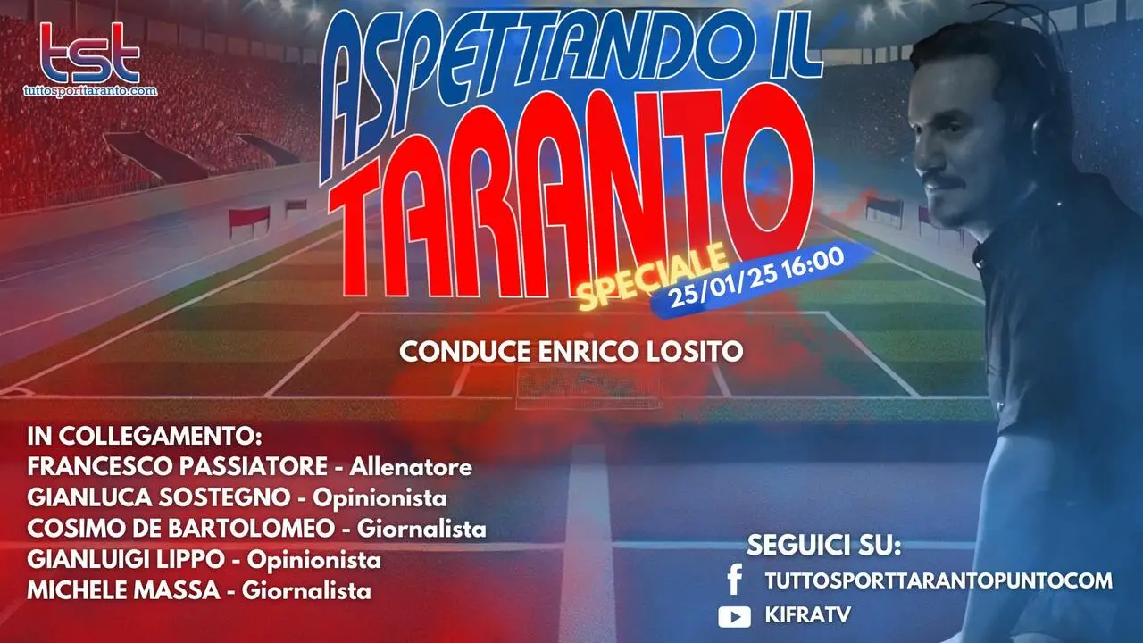 Sabato 25 gennaio dalle ore 16:00 in diretta puntata speciale di “ASPETTANDO IL TARANTO”, il contenitore sportivo a cura della redazione di Tutto Sport Taranto.com condotto da Enrico Losito con la regia di Claudio Ingrosso. Nel corso della puntata tratteremo le tematiche di stretta attualità del Taranto Fc 1927 in studio ci sarà il nostro redattore Cosimo De Bartolomeo in collegamento ci saranno: Gianluca Sostegno, opinionista; l’allenatore Francesco Passiatore; il nostro redattore Cosimo De Bartolomeo, Michele Massa, giornalista di Vesuvio Live e il nostro Gianluigi Lippo; Vi aspettiamo in diretta sulle pagine ufficiali Facebook e Youtube di Tutto Sport Taranto e Ki.fra tv dalle ore 16:00 con le vostre domande, commenti e opinioni…NON MANCATE!!! Il contenitore sportivo è stato realizzato grazie al supporto di Ipersport in via per S. Giorgio Jonico km 10 (contrada Cimino) a Taranto; Studio Radiologico San Tommaso in via Luigi Settembrini, 232 a Talsano (TA); Studio Fornaro-Occhinegro dottori commercialisti associati, in Piazzale Dante, 8 a Taranto; in via Skanderbeg, 64 a Bari e in via Einaudi, 10 a Locorotondo (BA); Ottica Dierre in Corso Italia, 329/331 a Taranto; Birroteca Puglia in via Cataldo Nitti, 14 a Taranto; Erario Ottavio Srls – Costruzioni edilizie in via Don Minzoni, 2 a Manduria (TA), Guernica - cucina pizzeria tarantina in via Acclavio, 4-10 a Taranto, Peperoncino Rosso Trattoria, via S. Francesco 13/b a Statte (TA).