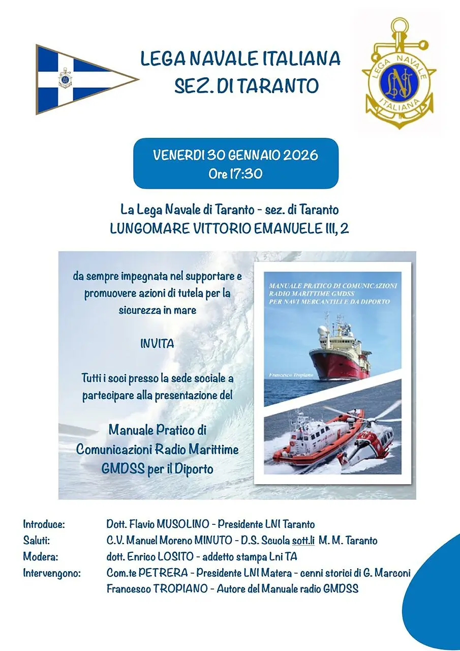 La Lega Navale Italiana Sezione di Taranto ospiterà, presso la propria sede situata su Lungomare Vittorio Emanuele III n. 2 , venerdì 30 gennaio (con inizio alle ore 17:30) la presentazione del libro “Manuale Pratico di Comunicazioni Radio Marittime GMDSS per il Diporto” scritto da Francesco Tropiano. Il nuovo sistema di comunicazioni radio marittime GMDSS, ha cambiato radicalmente il modo di comunicare fra navi, navi e stazioni radio costiere e le Autorità Marittime. Così l’autore dell’opera Francesco Tropiano, ex ufficiale radiotelegrafista su navi mercantili presenta l’opera: “La mia esperienza lavorativa su navi mercantili da Ufficiale radiotelegrafista di 1^ classe, Ufficiale di coperta e docente del GMDSS, mi hanno incoraggiato a scrivere questo Manuale pratico radio, dedicato a tutti gli Ufficiali di navi mercantili, del diporto e gli allievi degli Istituti Tecnici Nautici. Sono descritti gli esempi di chiamate e messaggi anche in lingua inglese di come gestire un soccorso, esempi per un messaggio di urgenza, di sicurezza e routine, argomenti utili a garantire una fattiva e costante formazione, per tutti coloro che in mare ci lavorano o si divertono. Troverete le informazioni di carattere tecnico per un buon approccio di tutti gli apparati radio presenti a bordo, quali il VHF-MF/HF DSC - R/T voce - INMARSAT - C - FLEET F77 - IRIDIUM - MEOSAR - EPIRB Cospas Sarsat - SART - AIS - AIS SART - PLB - PLB AIS - ELT - NAVTEX - TEST – Batterie di emergenza e tante altre importanti informazioni.Carissimi, il mio augurio è che il Manuale radio GMDSS possa essere utile a rafforzare la vostra conoscenza tecnica, permettendovi di rispolverare e chiarire molti concetti che nel corso degli anni si possono dimenticare, strumento indispensabile per le comunicazioni radio marittime, da portare sempre a bordo”. All’incontro interverranno, oltre all’autore, il dott. Flavio Musolino, presidente LNI sez. Taranto; il C.V. Manuel Moreno Minuto, D.S. Scuola sottufficiali M.M. Taranto; Com.te Rocco Petrera, presidente LNI sez. Matera; modererà l’evento il giornalista Enrico Losito, addetto stampa della LNI sez. Taranto.